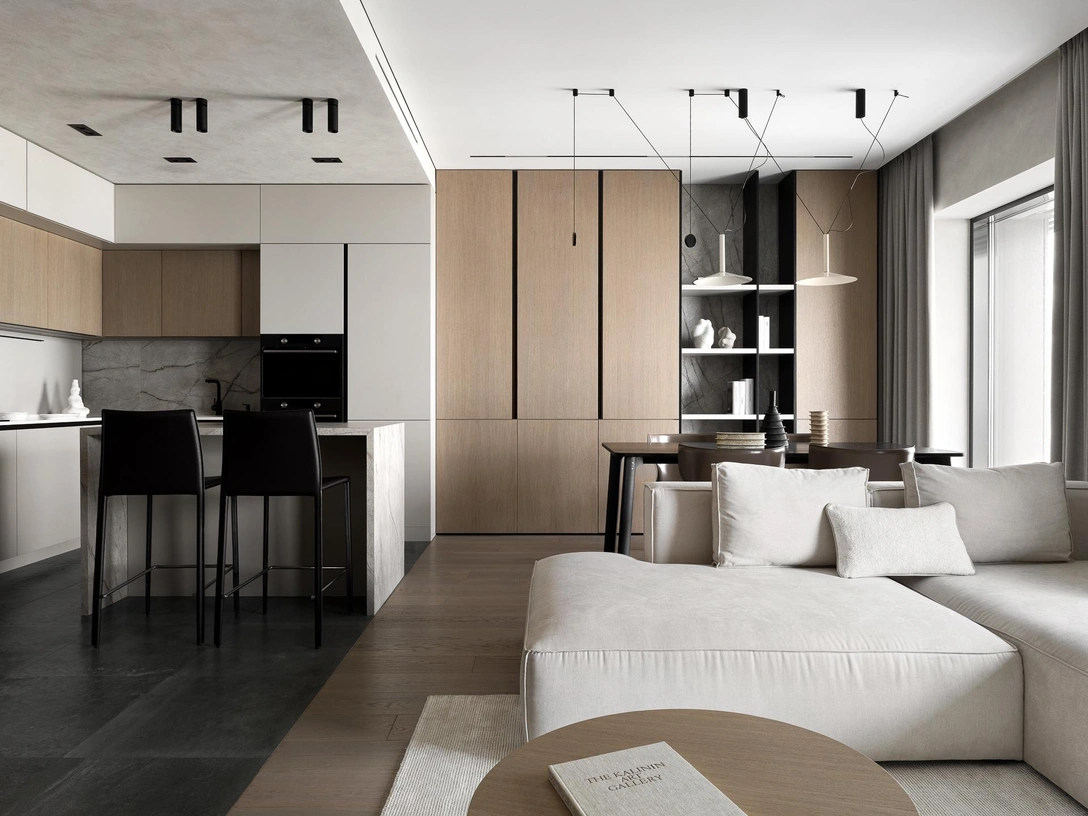 Цветовая гамма построена на нейтральных оттенках, дополненных теплым деревом и разнообразными текстурами, которые добавляют глубину и динамику.
