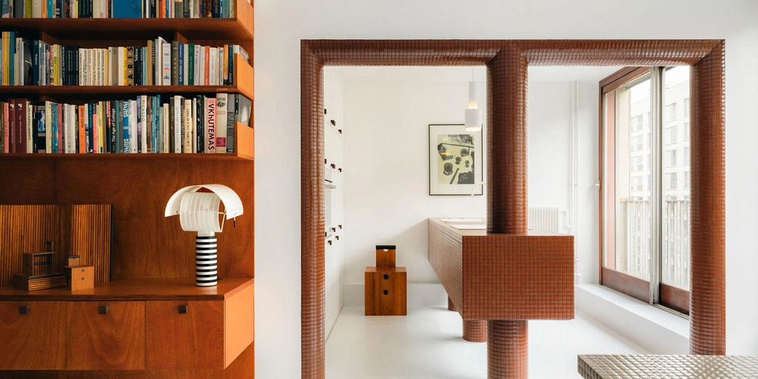 Эта двухкомнатная квартира в XI округе Парижа проходная — комнаты расположены анфиладой. От входной двери можно попасть в просторную гостиную, выходящую на запад. Здесь объединены зона отдыха, столовая и рабочий уголок.