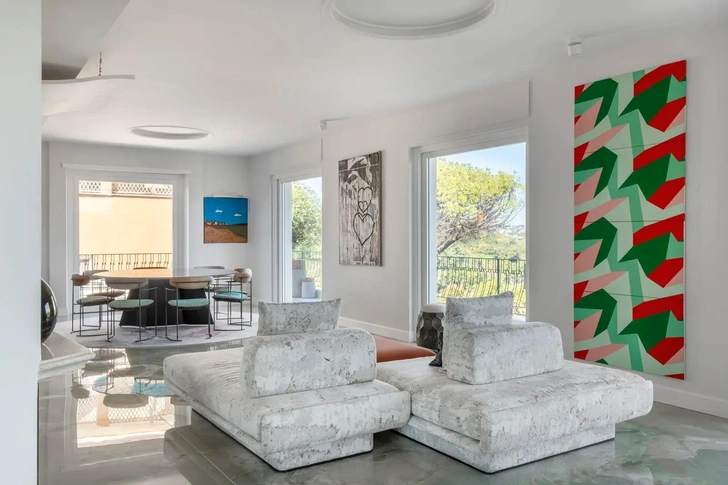 Владельцы являются страстными коллекционерами, поэтому в квартире представлены работы Арнальдо Помодоро (Arnaldo Pomodoro), Тано Фесты (Tano Festa), Миммо Ротеллы (Mimmo Rotella), Марио Скифано (Mario Schifano) и Серафино Майорано (Serafino Maiorano). Произведения вписаны в интерьер так, что они не перегружают пространство, но занимают в нем центральное место.