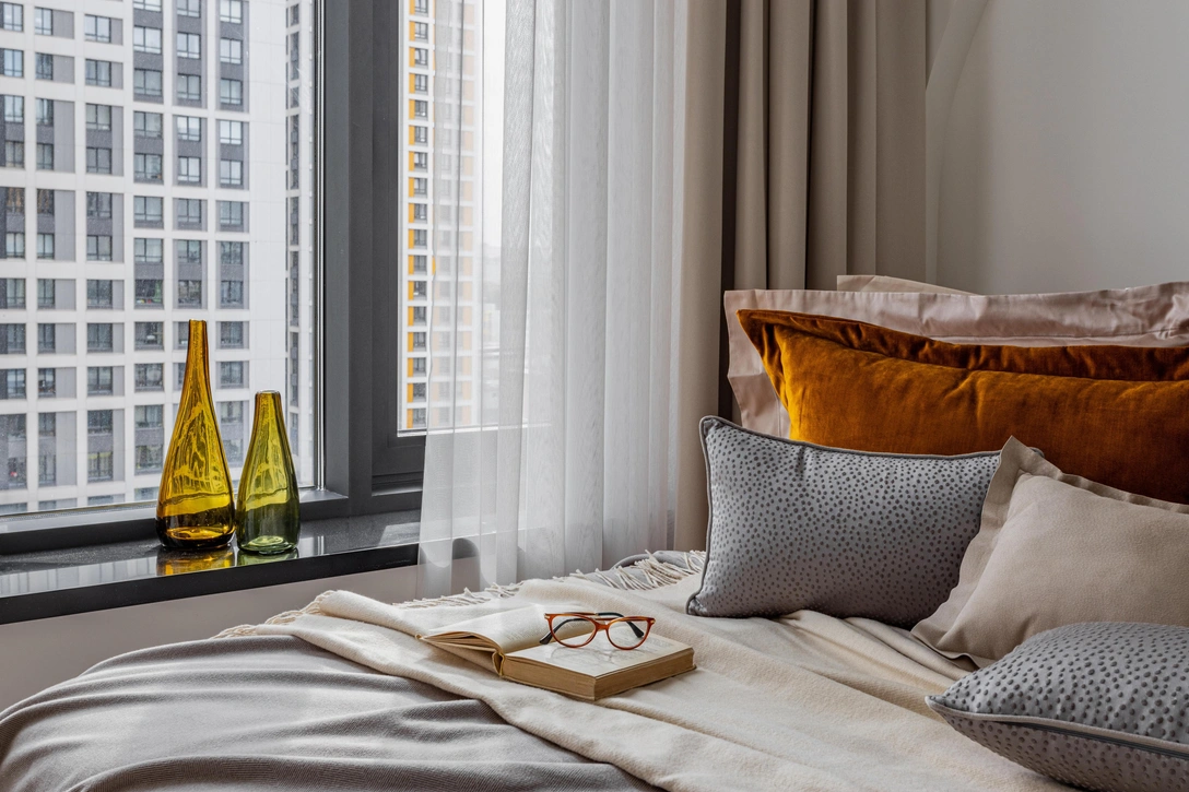 Решение с рифленым стеклом повторяется в спальне хозяйки — здесь за стеклянными раздвижными дверями скрыта гардеробная. Изголовье кровати выделяет ниша в виде арки, очертания которой перекликаются с рисунком на ковре.