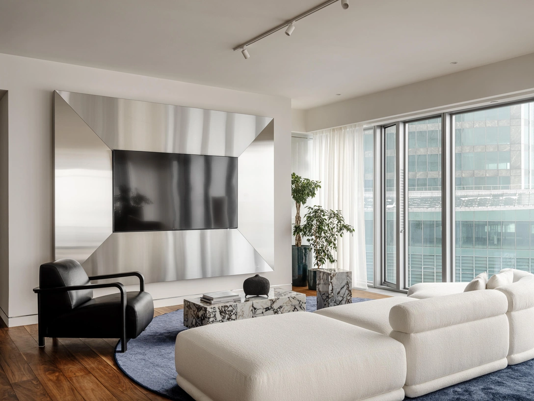 Я выделила две личные зоны — мужскую и женскую, каждая оформлена с учетом индивидуальных предпочтений и потребностей. Центральным местом стала общая гостиная с обеденной зоной: здесь есть несколько интересных деталей. Например, колонна от застройщика, которую мы облицевали зеркальными панелями — она будто растворилась в интерьере.
