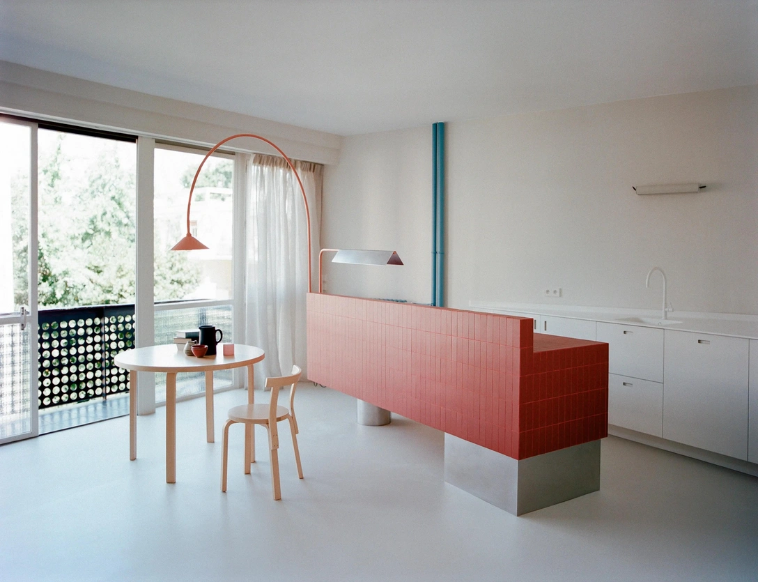 Для начала дизайнеры сняли старую отделку. В процессе демонтажа команда обнаружила обои, которые Ле Корбюзье разработал для швейцарской фабрики Salubra в начале 1930-х годов. К сожалению, сохранить их не удалось, и студия решила сделать стены просто белыми. Однако голубой оттенок обоев появляется на радиаторах, несущих колоннах и открытых трубах по всей квартире.