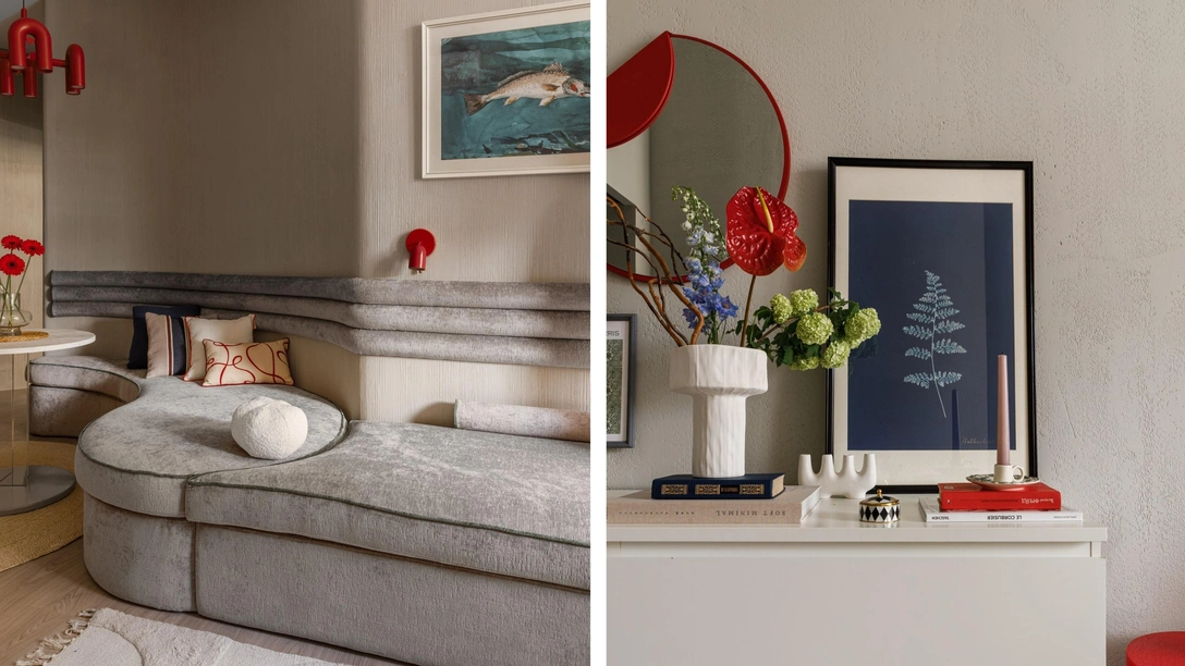 Мой подход Strict&Soft основан на минимализме, но не таком стерильном, а с душой: обычно это устойчивая база, которая создает чувство стабильности, и яркие детали, которые добавляют индивидуальность, мягкость и уют. Цветовую гамму здесь выстроили на сочетании теплого серого цвета с яркими акцентами — красным, терракотовым, персиковым и синим. Заказчице понравились наши смелые предложения — она сама очень творческая, любит вау-эффекты и всегда открыта новому.