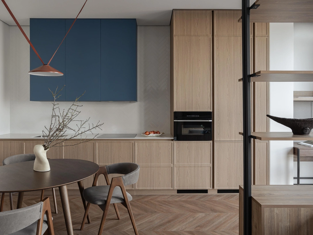 В проекте всего несколько цветов: синий, оттенки дерева, серый текстиль и светло-серый фон. У нас получился интересный диалог материалов: например, «елочка» на полу у нас перекликается с плиткой на фартуке и в ванной, уложенной в такой же манере.