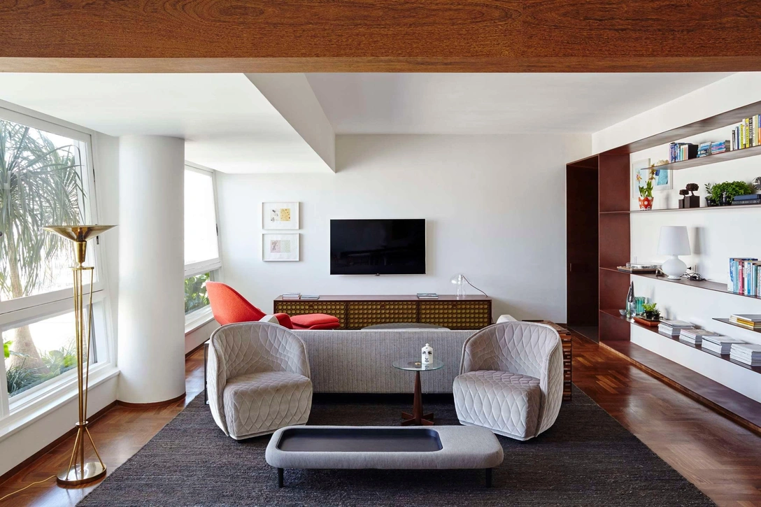 Изготовленный на заказ буфет с решеткой из золотистых колец и шкаф с сетчатым фасадом под телевизором на противоположной стороне комнаты отсылают к историческому декору здания. Остальная мебель выбрана либо времен модернизмома середины века (стулья Нильса Отто Моллера, кресло Ээро Сааринена, винтажные шведские лампы 1950-х годов) либо более современными предметами, такими как два кресла по дизайну Патрисии Уркиолы и стеганый журнальный столик GamFratesi .