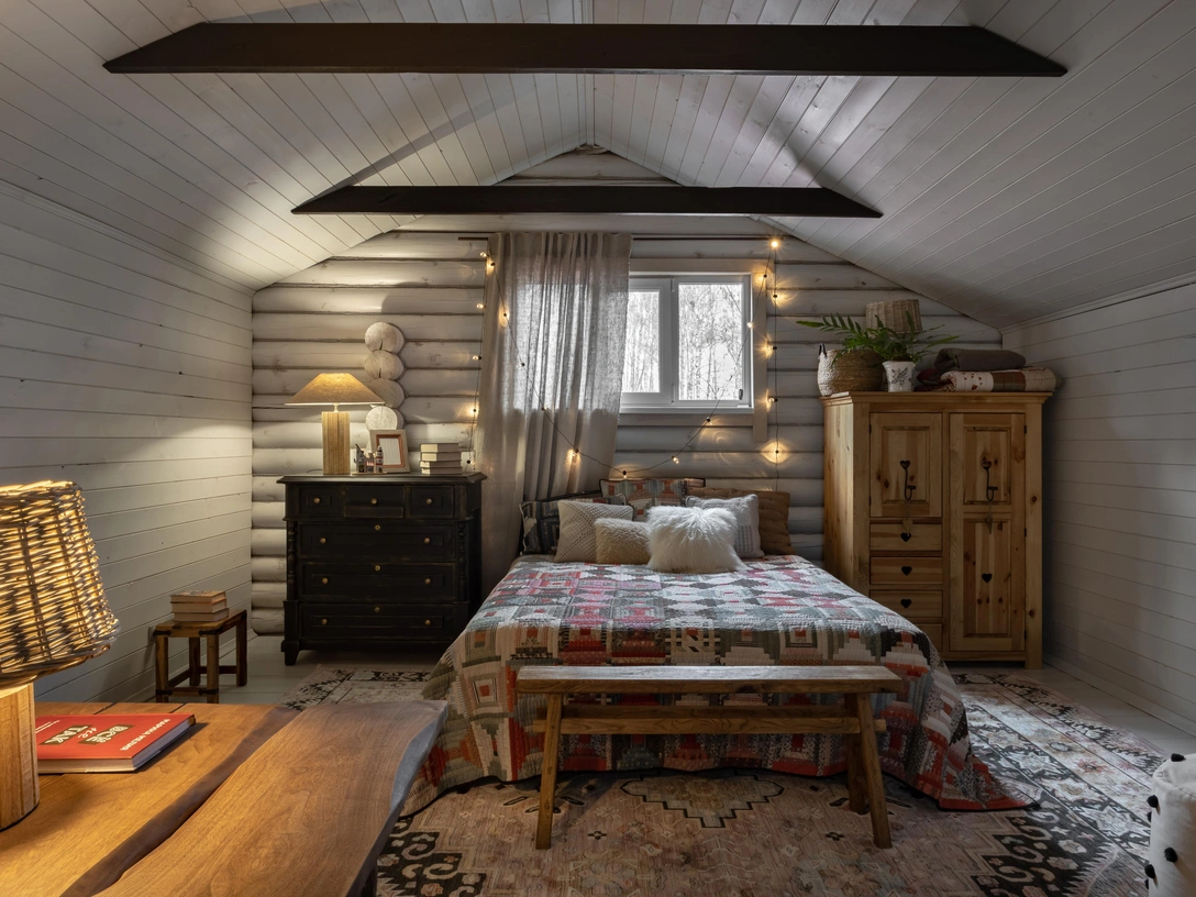 Когда дом только купили, на мансарде не было ничего, кроме ведущей к ней лестницы. Но она не оставляла нас с Катериной в покое, и мы решили сделать ее жилой. Прорубили два окна, хорошо, что сруб позволяет. С естественным светом мансарда преобразилась — просто не узнать! Я давно работаю с деревянными домами, поэтому мои знания помогли.