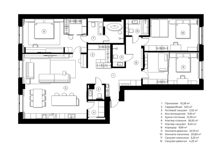 Мы устроили тотальную перепланировку: разрушили старые стены и возвели новые. Так удалось поделить квартиру на 2 зоны: парадную «взрослую» и приватную «детскую». Их разделяет холл с гардеробной. Слева расположилась просторная кухня-гостиная, из нее можно попасть в мастер-спальню, а справа — коридор, ведущий в детские. Необходимо было организовать целых 4 санузла, у каждой спальни свой. Это было довольно сложное решение, потому что мокрых зон было не так много.