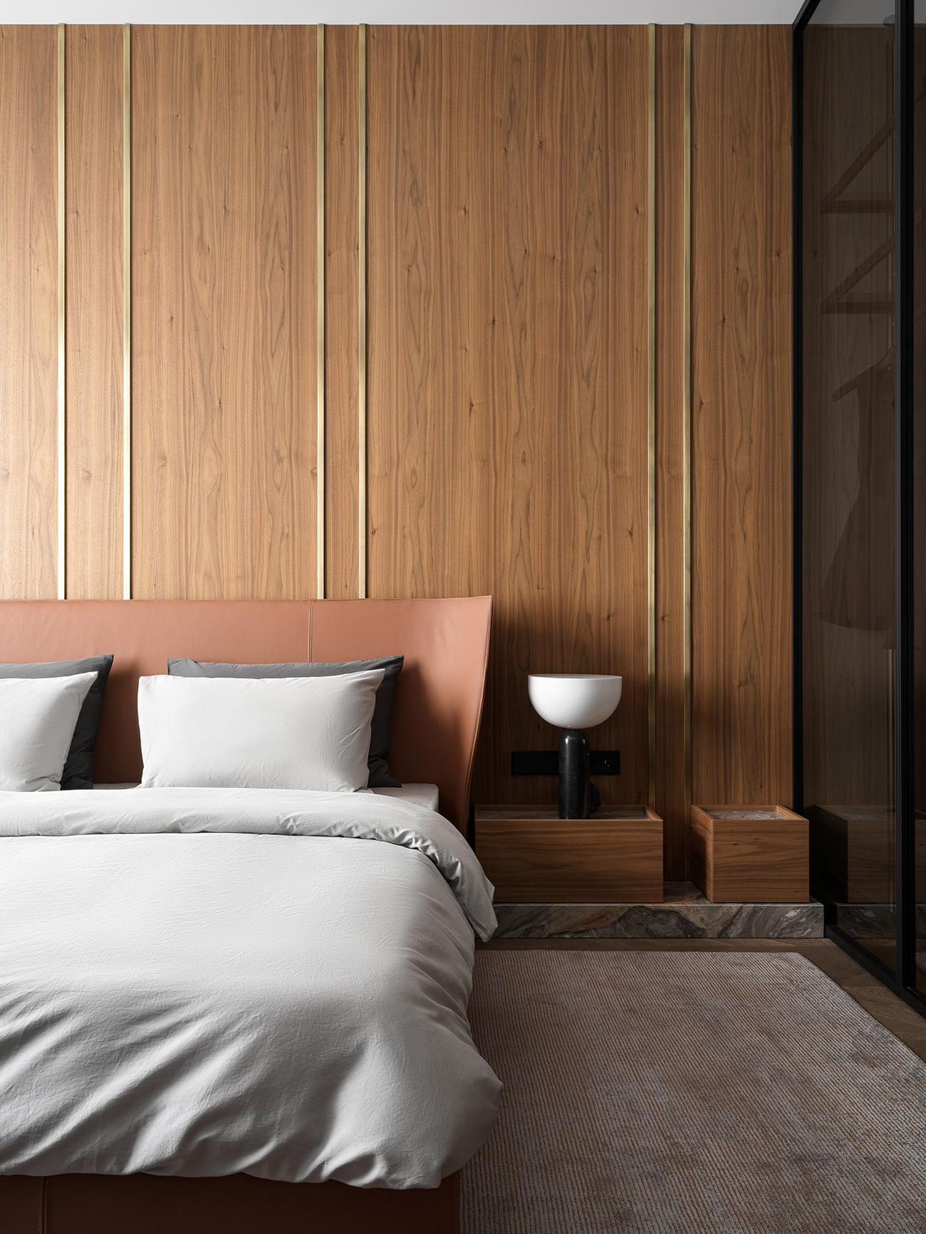 Нам нужно было создать функциональное пространство с ярким характером. Основная цветовая палитра складывалась вокруг цвета мореного эвкалипта, рыжей кожи, мрамора и темного гранита. Цвета натуральные, спокойные, сложные. Более насыщенные цвета, пыльно-розовый и сложный синий, мы использовали в детском блоке.