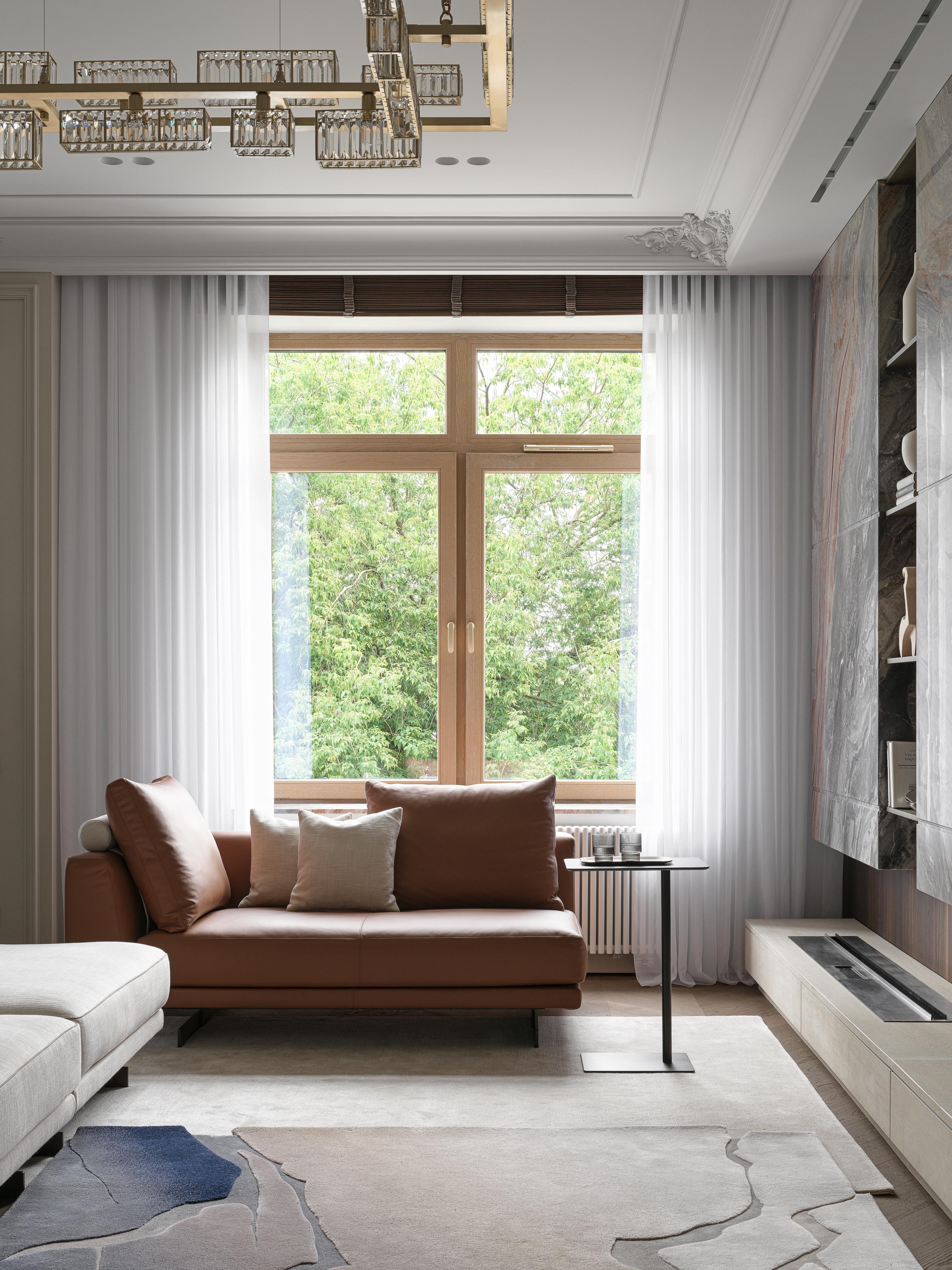 Почти вся мебель в гостиной итальянская. Заказчик большой ценитель дорогой качественной мебели, предметов искусства — он просил, чтобы каждый элемент здесь имел историю, был особенным. Ковер от Tai Ping, например, хозяин выбирал самостоятельно, привез его из Парижа. Он стал главным акцентом гостиной.