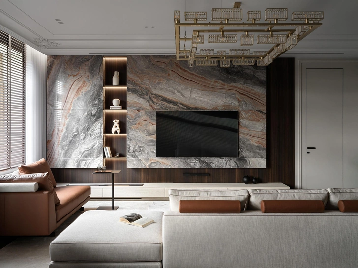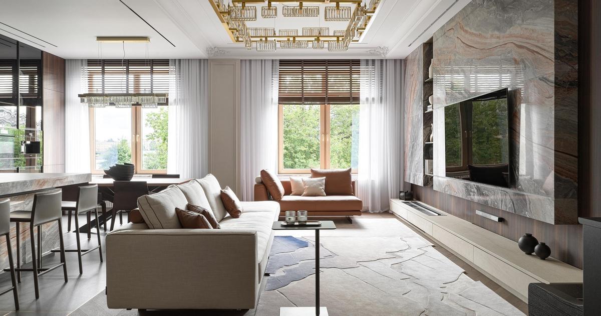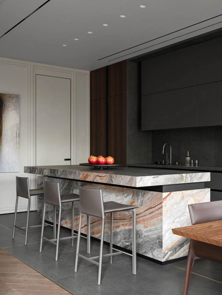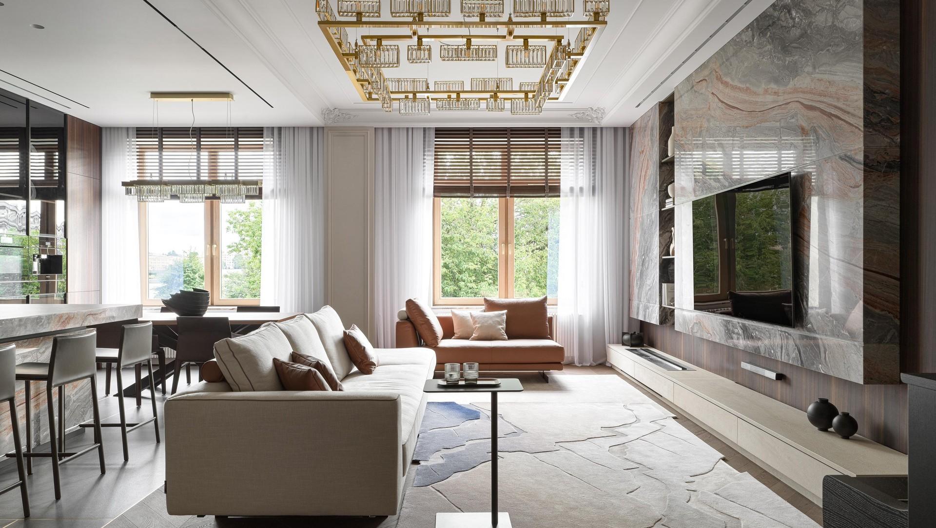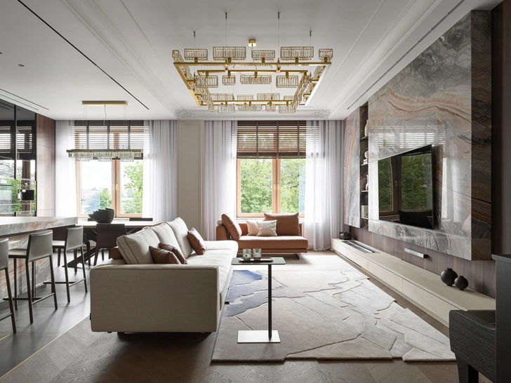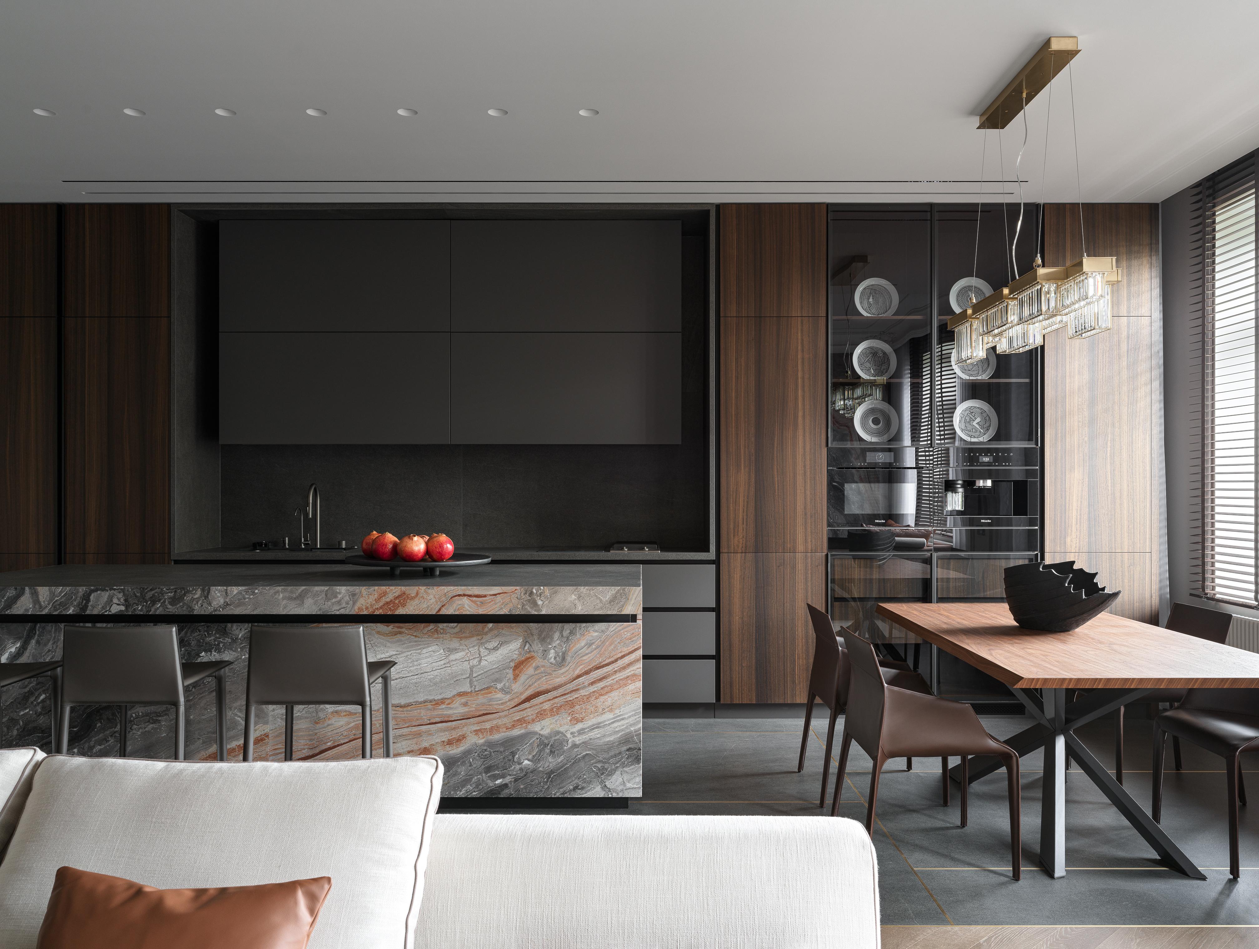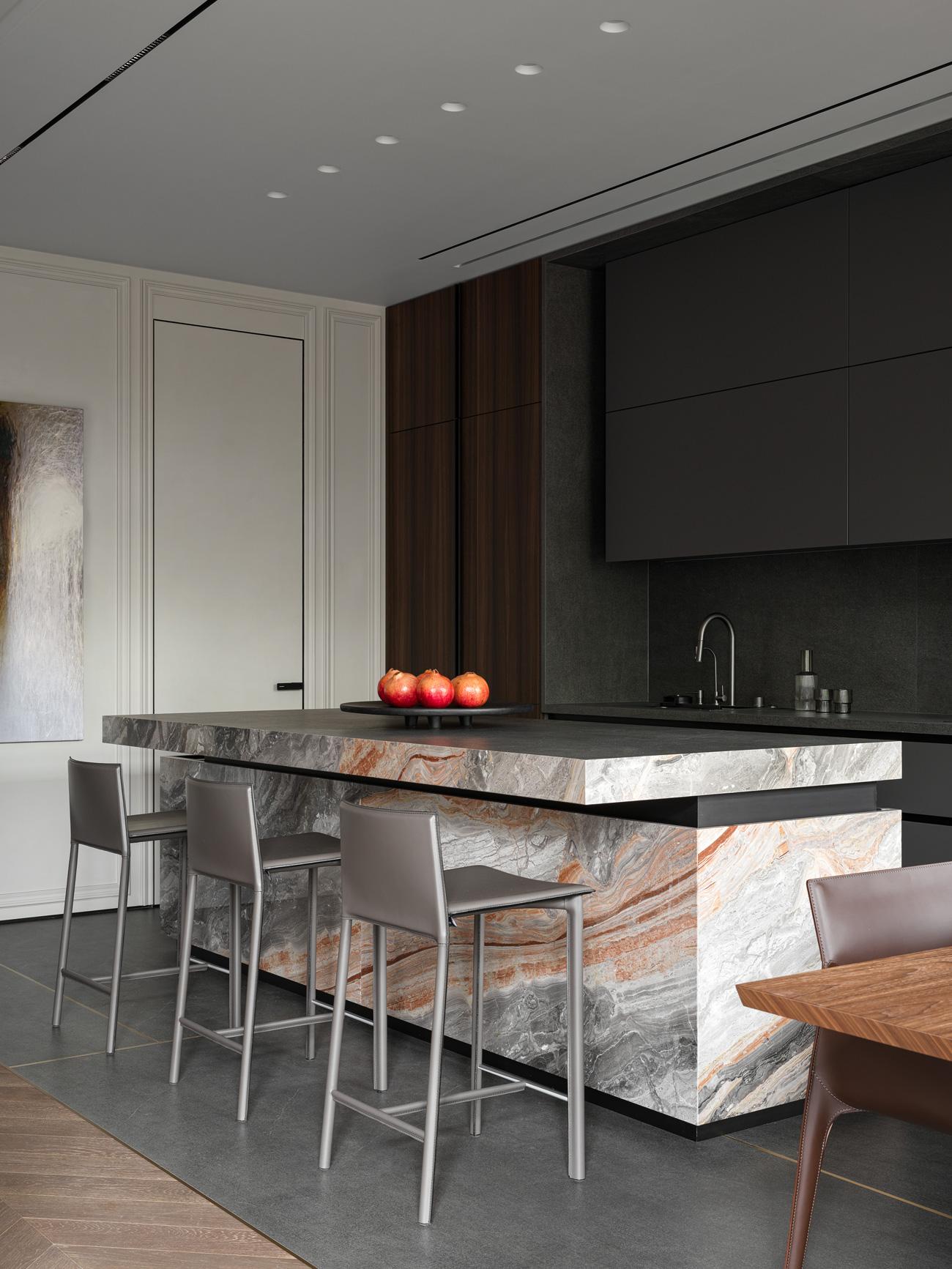 Декоратор Ирина Генделева виртуозно подобрала декор, помогла с ним и с мебелью компания Laboratory Dome, наши давние партнеры. В проекте особенно выделяется мрамор: его можно заметить в оформлении острова и ТВ-зоны. Сложнейшая металлическая конструкция держит мраморную стену весом более 500 кг. С обратной стороны на той же стене размещена четырехметровая парящая столешница без опор. Это решение потребовало множество времени: нужно было собрать разных подрядчиков, чтобы довести результат до идеала. Так что простые на первый взгляд формы требуют очень сложных решений. Про работу с мрамором после этого проекта мы можем написать целую книгу, не иначе!