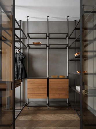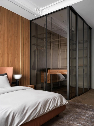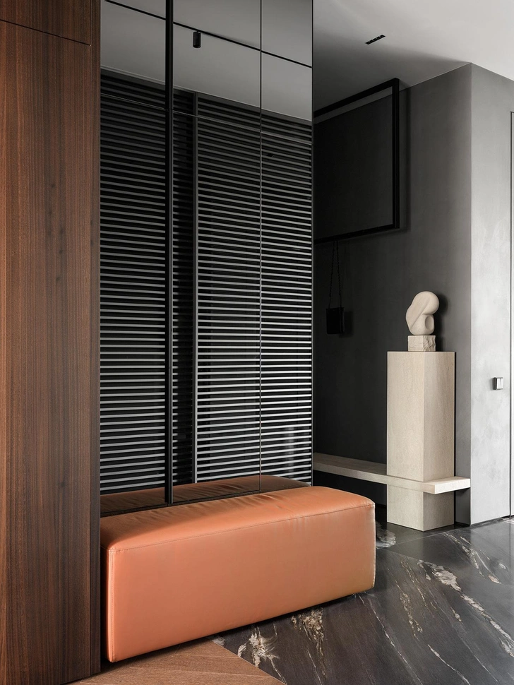 Несмотря на то, что в проекте используются элементы классической отделки, в нем много современных решений, требующих высокого мастерства. Мы идеально встроили теневые швы, все примыкания между разными материалами, стыки паркета и плитки, вставки из латуни, примыкания шпона к стенам из декоративной штукатурки. Все эти простые с виду решения без профессионализма строительной компании не были бы так гармоничны и хороши.