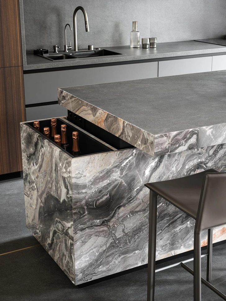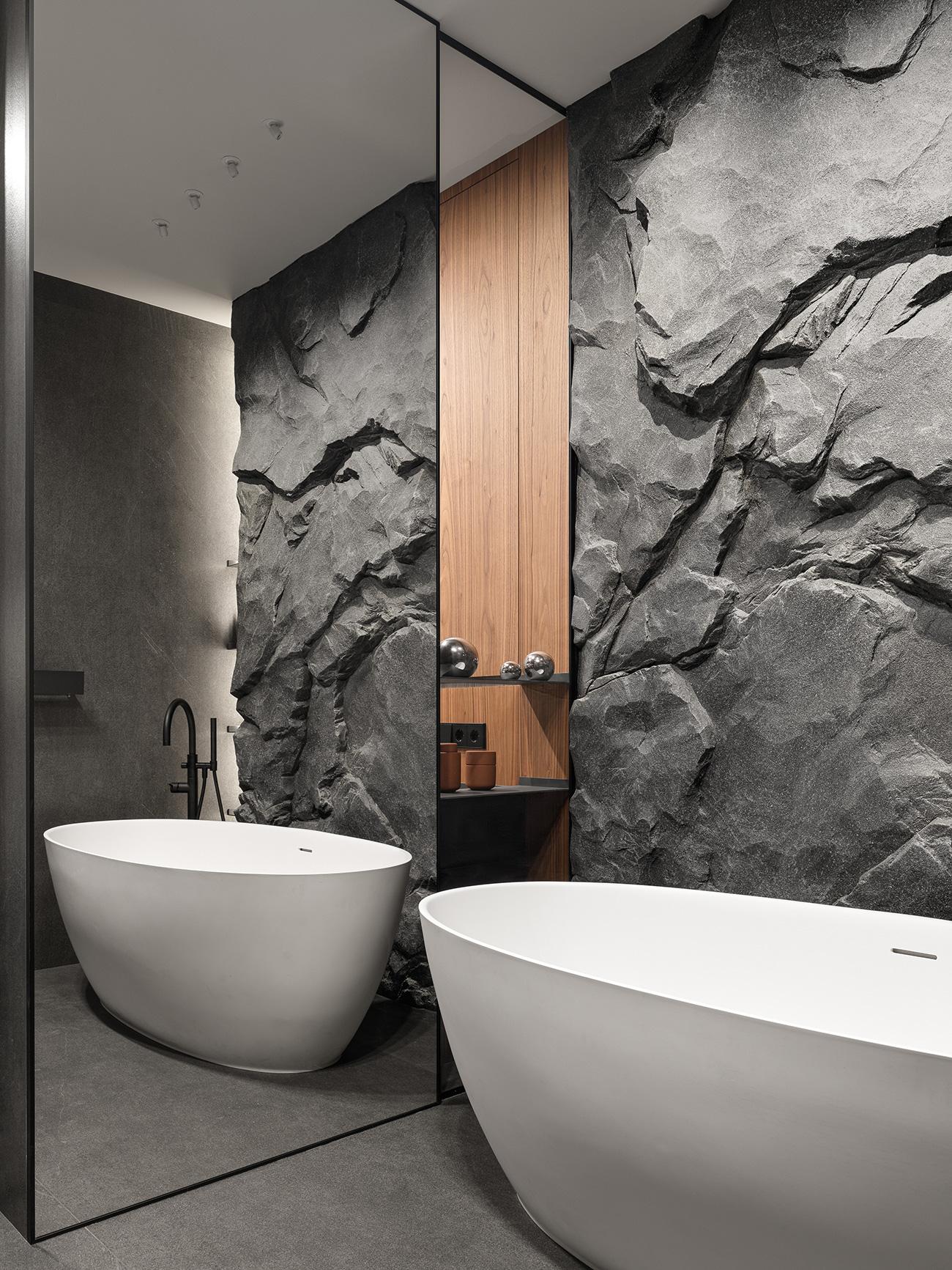 Каждый слэб выбирали по фотографиям и видео. После доставки в Россию мы осматривали каждый камень. Заказчик твердо сказал, что залитые смолой каверны недопустимы, хотя у материала разная плотность, и какие-то кусочки при нарезке выпадали. Перед нами стояла задача собрать нужный нам узор, не используя кусочки с кавернами. Мы отсканировали весь мрамор, сняли фото и видео, а затем делали раскладку. Это была работа длиной в несколько месяцев — пришлось изрядно попотеть, чтобы воплотить это идею. Получилось хорошо. Правда, смотреть на этот мрамор пару месяцев всей командой не могли, столько сил в него вложили, столько было сложностей и нервов…