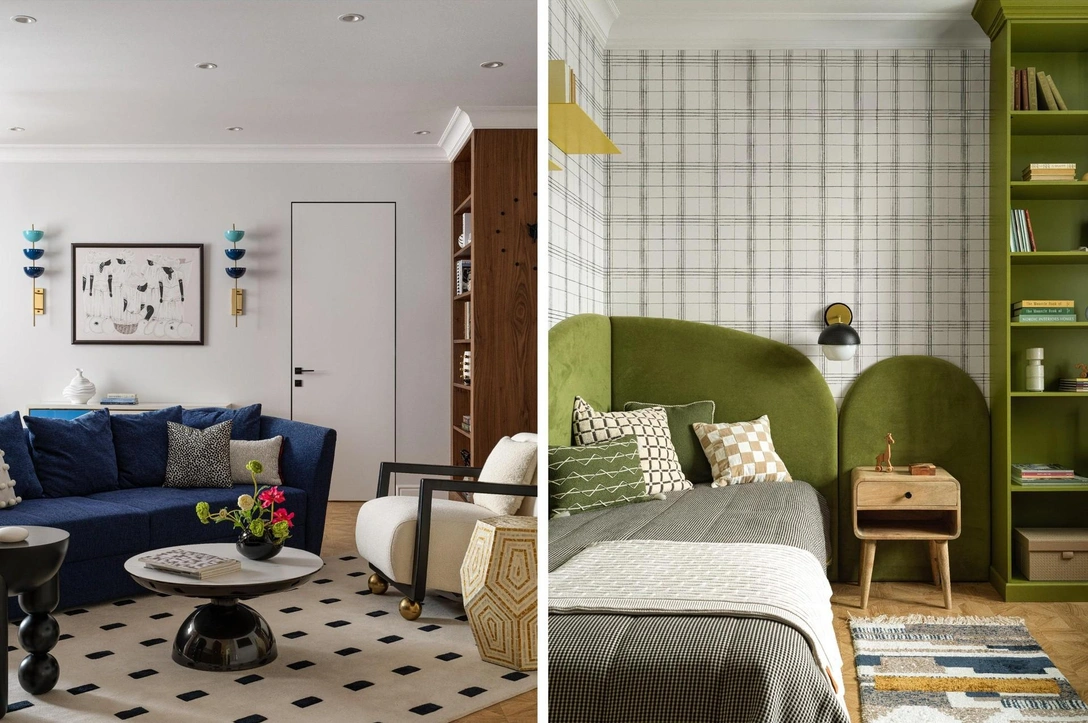 В другой комнате живет маленький любитель динозавров, поэтому главным стал зеленый цвет. Форма кроватки и роспись на фасадах шкафа — это стилизованный хребет стегозавра и очертания туловища бронтозавтра. В форме динозавров даже желтые полочки для книг! А чтобы немного заземлить, успокоить такое динамичное пространство, мы добавили клетчатые обои, которые в подростковом возрасте можно не менять — они довольно нейтральны.