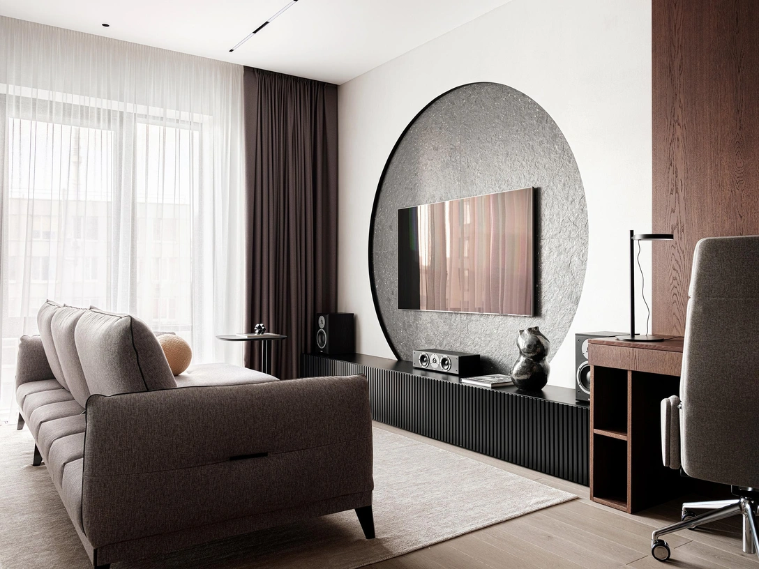 Перед нами стояла задача сделать современный и выразительный интерьер со своим характером. Концепция родилась у нас тогда, когда мы начали обдумывать основную зону кухни-гостиной. Все началось с ТВ-зоны, главного акцента этого пространства: ее видно прямо со входа, поэтому мы решили, что она должна задавать настроение всему пространству.