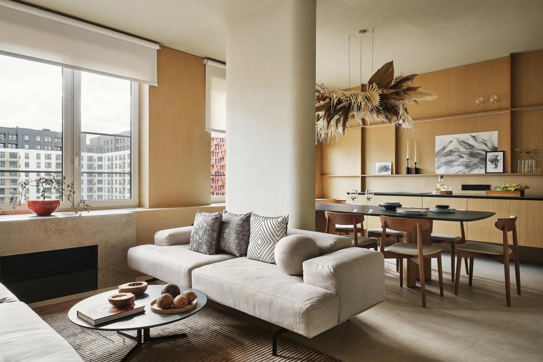 Этот проект не перегружен декором: хороший дизайн — это как можно меньше дизайна, так что в отделке мы использовали только два цвета — бежевый и дерево. Мы вычистили пространство: установили двери скрытого монтажа, теневой плинтус и подвесили кухню, а стены, пол и потолок отделали в одном цвете — так интерьер выглядит визуально больше и чище.