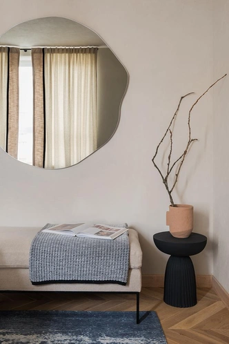 Самое важное — функциональная планировка и продуманное хранение. Мы выделили кухню-гостиную для приема гостей, мастер-блок с гардеробной, детскую, прачечную и гостевой санузел. Самый необычный предмет — кухонный остров, который заменил стандартный обеденный стол — он выступает центром жизни квартиры: здесь можно готовить, собираться и работать. Это хороший вариант для временного жилья.