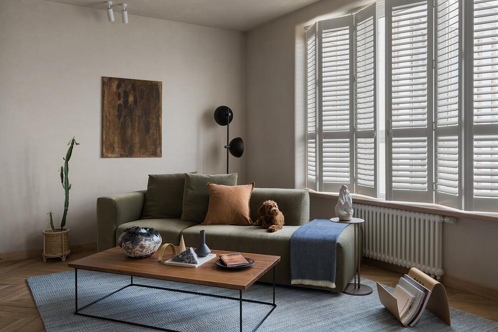 Штукатурка песочного оттенка для текстурного и теплого фона, зеленые и голубые акценты в текстиле, отделке и аксессуарах, натуральное дерево на полу, белые шаттерсы на окнах — все это создает ощущение спокойствия, прибрежного уюта.