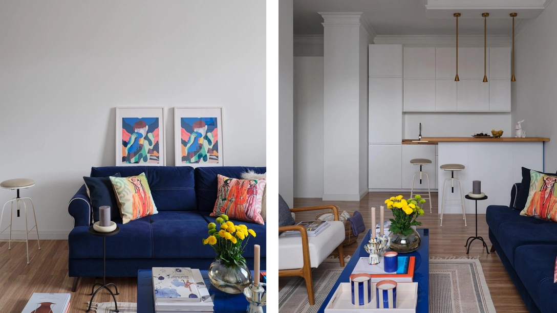 Заказчица — молодая независимая девушка. Она хотела, чтобы интерьер был наполнен яркими акцентами и отражал ее любовь к путешествиям. В качестве цветовой базы мы решили выбрать белые стены и светлый ореховый пол, а акцентными мы сделали текстиль и декор (оттенки глубокого синего, латуни и фуксии).