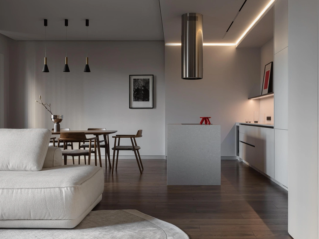 «Центр кухни — остров с каменной столешницей и лаконичным дизайном. Шкафы встроены, фасады сливаются со стенами, создавая эффект чистого объема. Матовые текстуры, черные акценты и открытая полка вместо верхних шкафов — минимум деталей, максимум смысла».