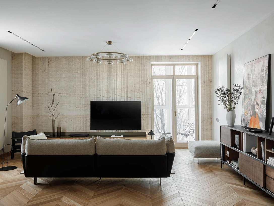 Квартира выполнена в монохромной гамме, в основу которой легли оттенки бежевого. Однако мебель архитектор выбрала темную, чтобы создать контраст и привнести динамику. Важную роль в интерьере играют фактуры: декоративная штукатурка, дерево, кожа, камень — все это складывается в единую гармоничную композицию.