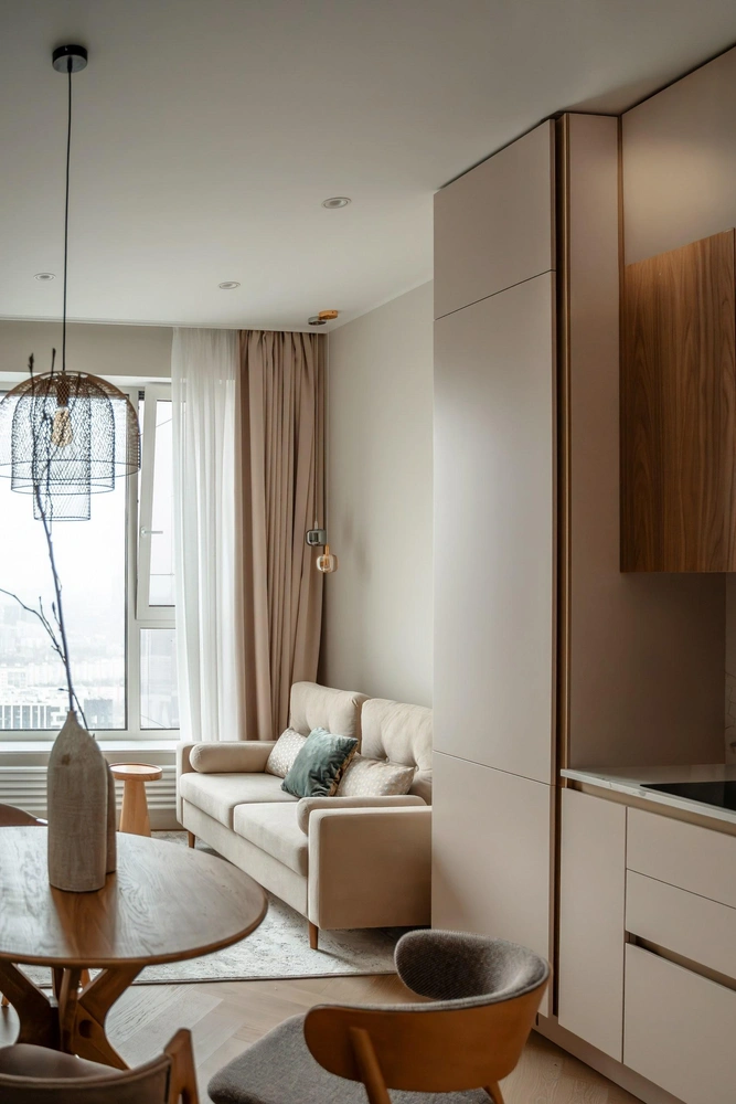 Хозяйка квартиры, молодая девушка, мечтала о «легком» элегантном и функциональном пространстве, которое стало бы отражением ее индивидуальности и личного вкуса. При выборе стиля интерьера дизайнер Марьяна Шепелева решила остановиться на минимализме и дополнить его элементами сканди и бохо. Акцент сделан на сочетании природных фактур и теплых бежевых тонов.