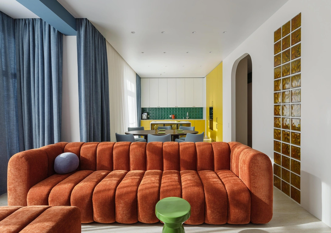 Интерьер получился очень красочным. На светлую базу дизайнеры широкими мазками наносили синие, оранжевые, желтые, зеленые и красные акценты. Одной из главных изюминок интерьера стали вставка из оранжевых стеклоблоков в гостиной. В солнечные дни стеклоблоки создают красивые цветные блики на стене коридора.