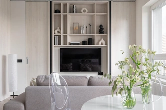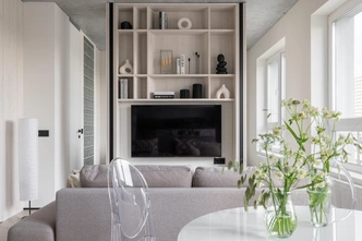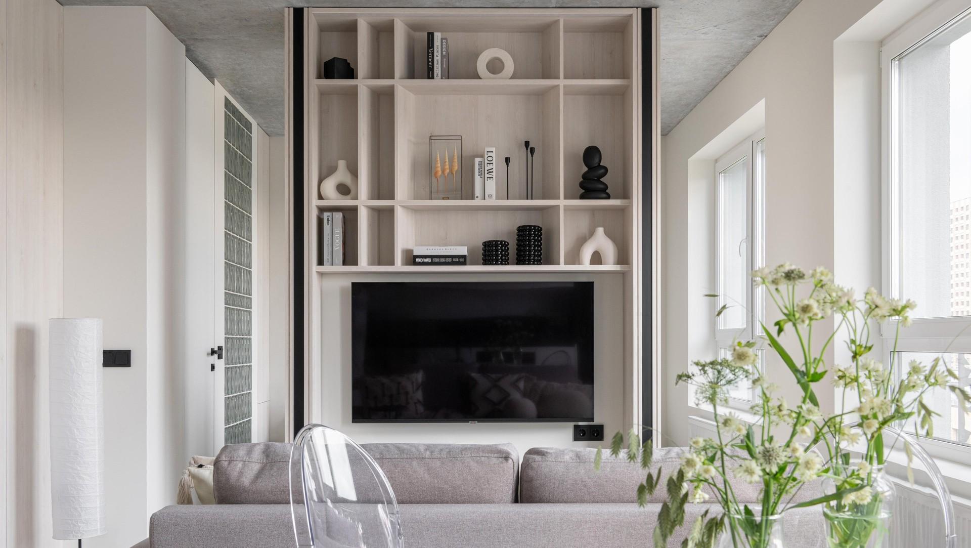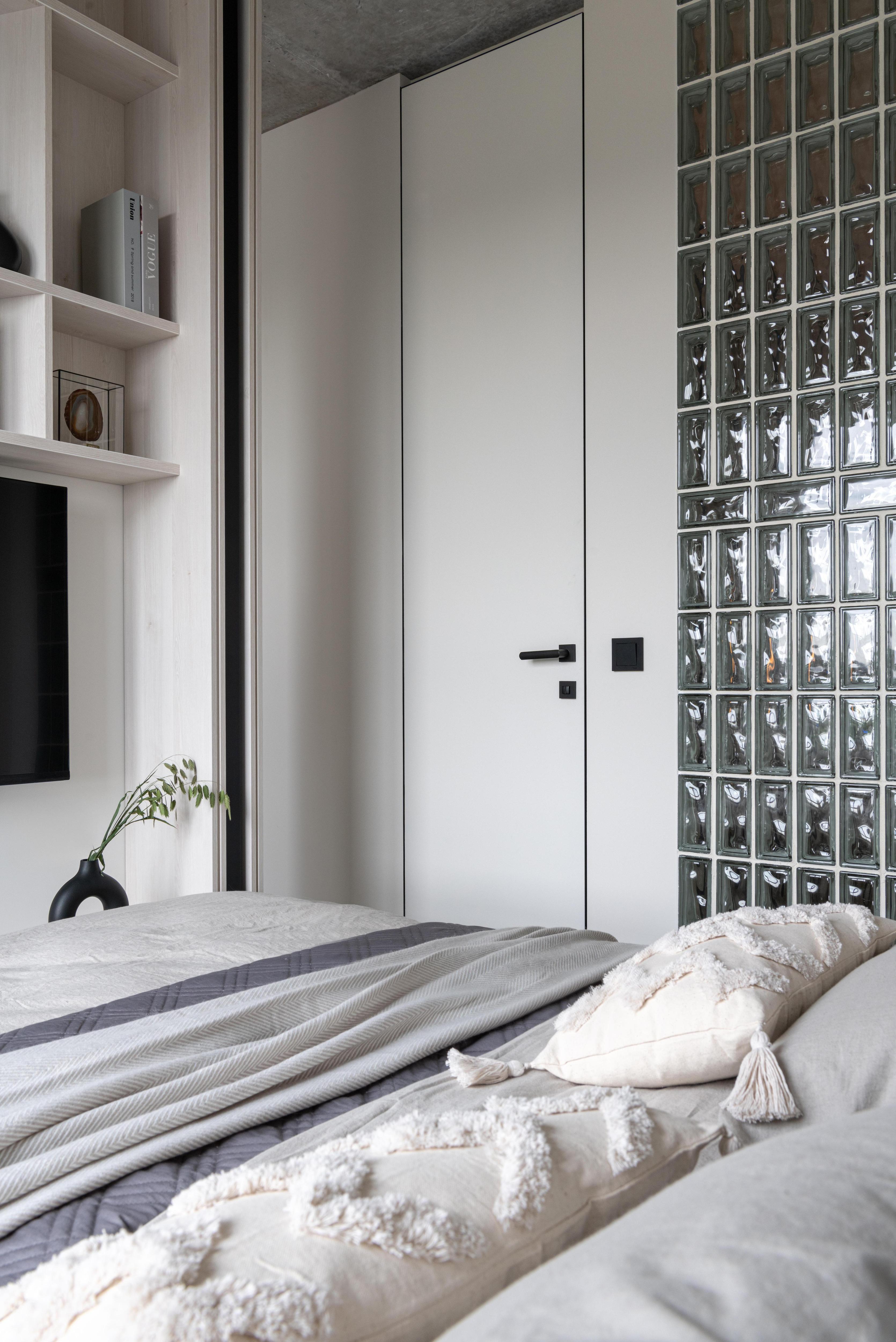 Самый необычный, интересный предмет в этом интерьере — двусторонний ТВ-шкаф-трансформер, который отделяет зону гостиной от спальни. Его боковые стенки откидываются, превращаясь в межкомнатные двери. Другой хороший прием — стена из стеклоблоков между спальней и санузлом. Благодаря этому здесь больше естественного света.