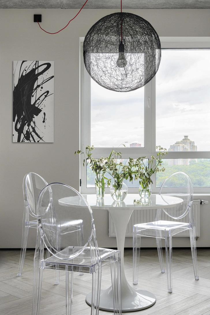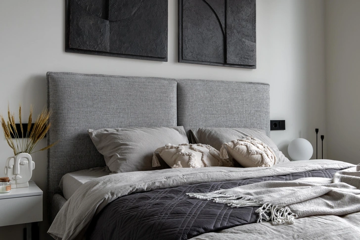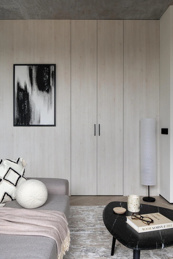 Мы особенно гордимся грамотной планировкой — удалось избавиться от бессмысленных коридоров и использовать площадь максимально эффективно. А с помощью баланса горизонталей и вертикалей мы добились ощущения простора, воздуха. Вот, например, двери в потолок — они помогли визуально вытянуть пространство.