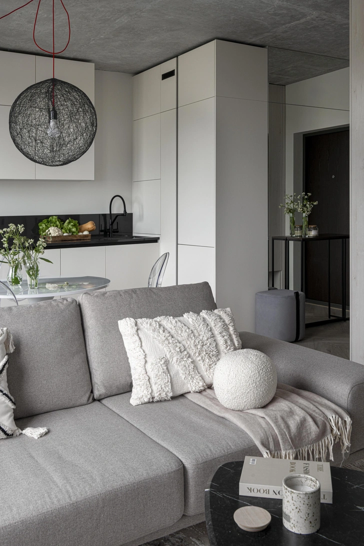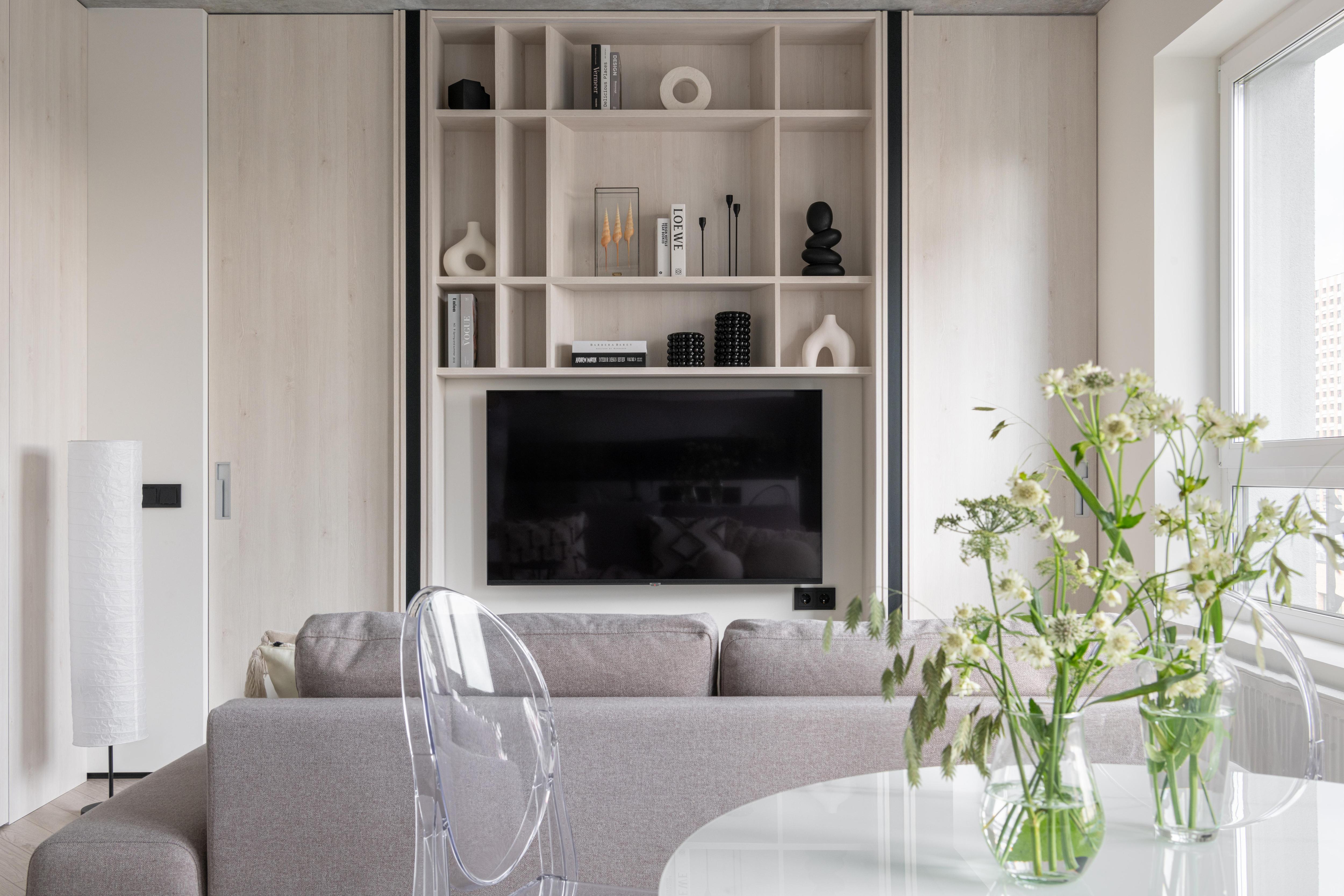 Квартира находится в ЖК «Домашний». Она планировалась как инвестиционная: когда ребенок заказчиков вырастет, квартира будет для него, а пока — для арендаторов. Пожелания были такие: нетрадиционная, неформальная, но удобная планировка для одного или двух человек. Интерьер нужно было сделать с интересными акцентами, которые выделили бы квартиру на фоне остального арендного рынка.