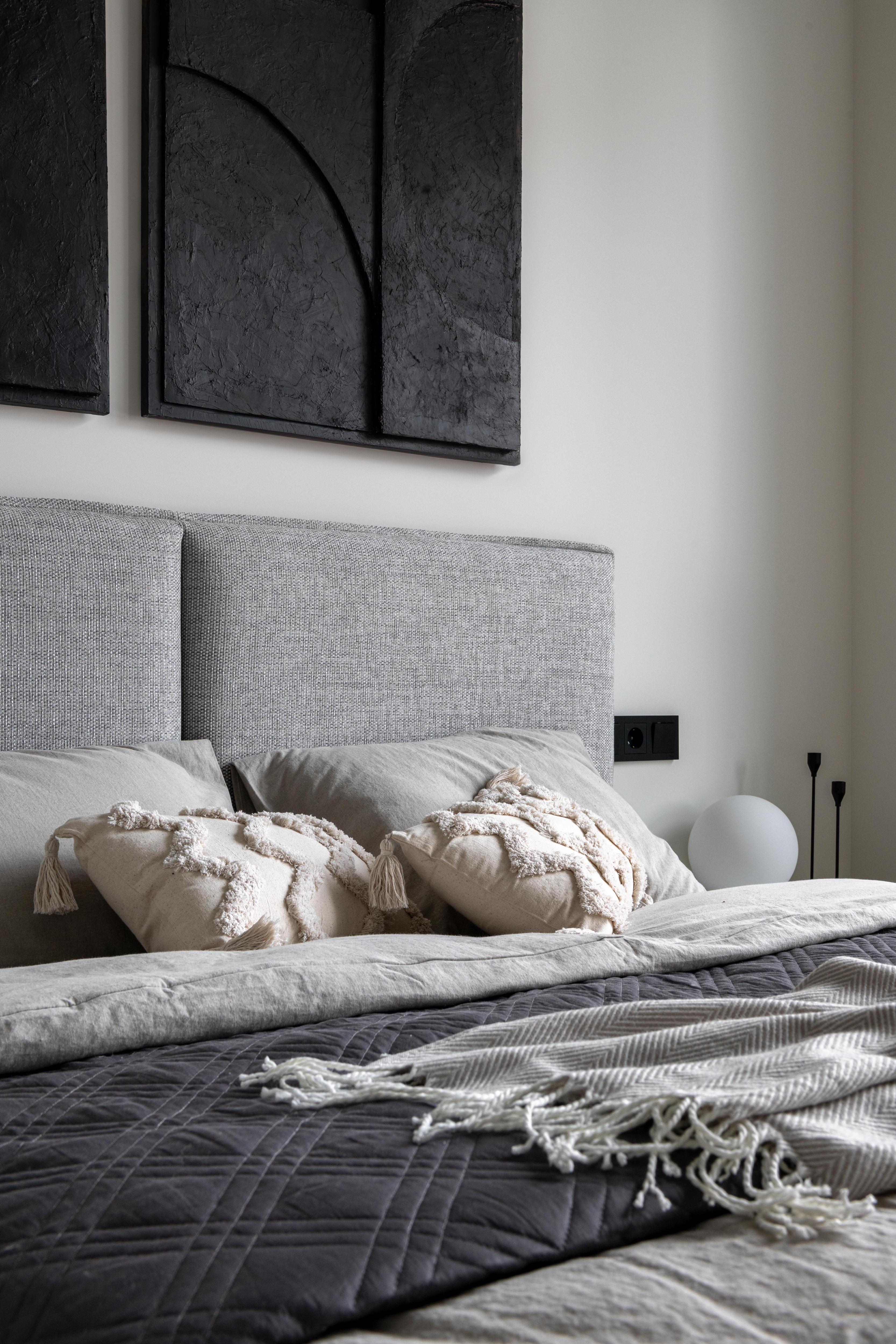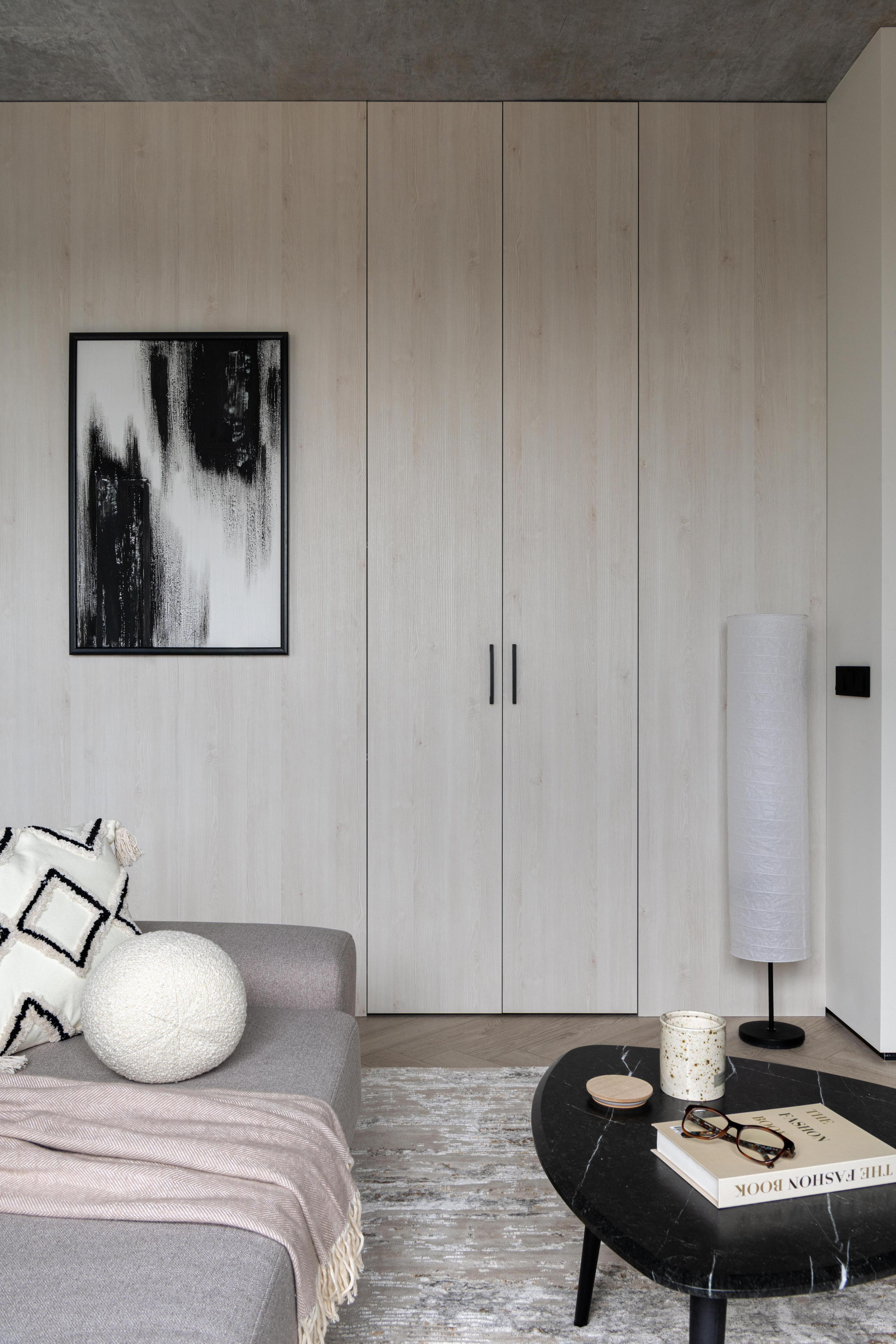 Цветовая гамма — светлая, нейтральная, построена на основе четырех цветов: черный, белый, серый и бежевый. Нам очень повезло с исходными данными: на такой довольно небольшой площади (всего 40 м2) нам удалось разместить все необходимое. Мы сохранили родной потолок из бетонных плит, но покрыли его тонирующим лаком, чтобы выровнять цвет и обеспылить. На таком потолке открытая проводка и накладные светильники смотрелась не очень красиво, поэтому весь свет мы перенесли на пол и стены, встроили в мебель. Получилось много разных сценариев.