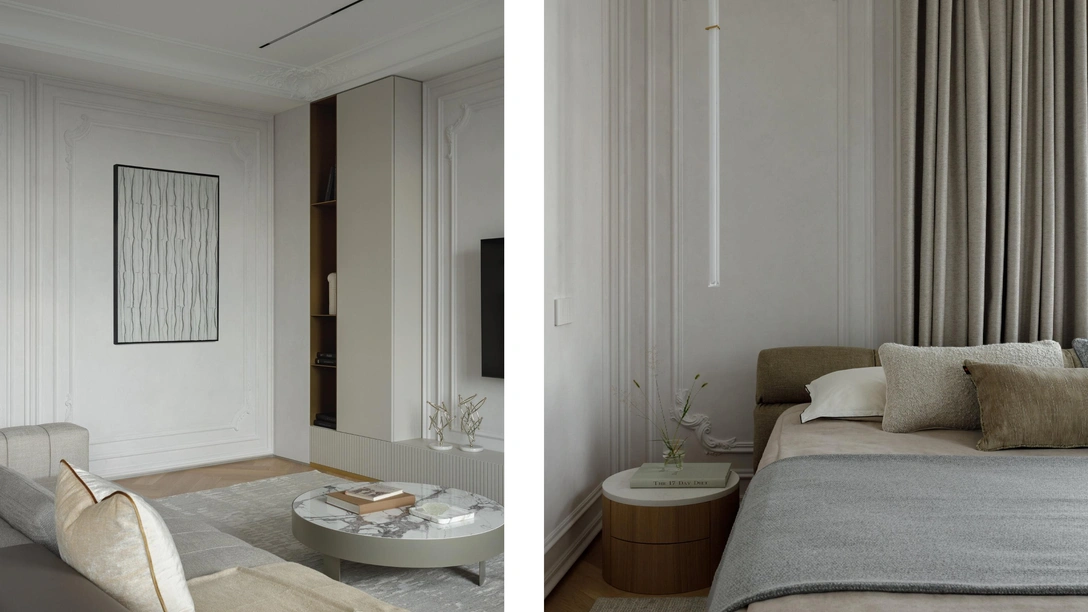 Заказчики — бизнесмен и его семья — живут в другом городе, в частном доме, и привыкли к комфорту. Квартира в Москве ему понадобилась из-за частых командировок в столицу. Перед командой стояла задача создать современный интерьер, но при этом сохранить классические элементы, привычные клиентам. Роскошь и классика для них синонимы — их частный дом выполнен в таком же, но более традиционном стиле. Здесь же мы решили добавить минимализма.