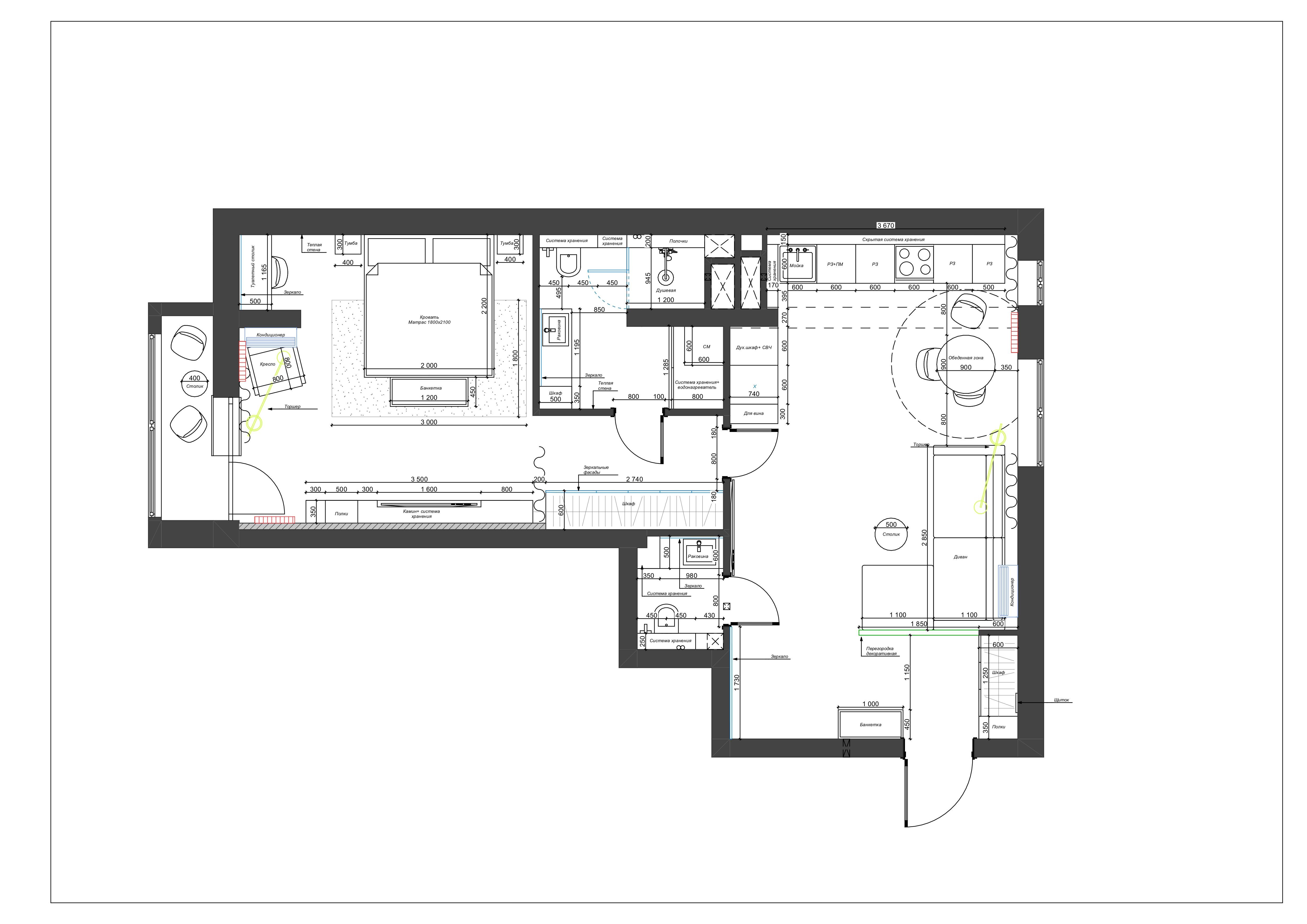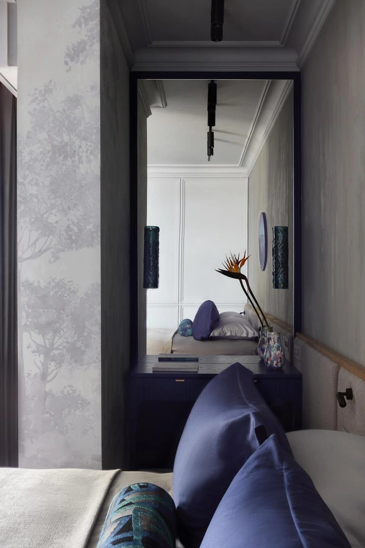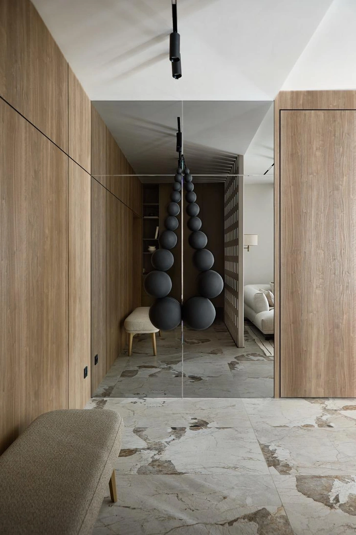 Отдельное внимание мы уделили работе со светом и визуальным объемом. Здесь много зеркал — как в прихожей, так и в спальне. Они не только расширяют пространство, но и умножают естественный свет, добавляя интерьеру глубину и легкость. Зеркало в прихожей как раз стало одним из самых необычных элементов: декоративные бусины на нем мы сделали в виде половинок, и, отражаясь, они «достраиваются» — получается интересный эффект. Он добавляет игры, объема и индивидуальный характер.