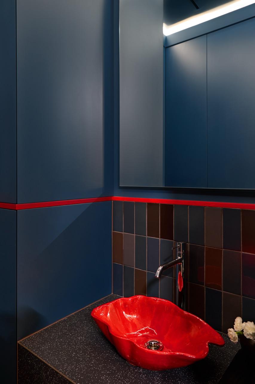 Гостевой санузел — самое яркое и контрастное помещение в квартире. Нам хотелось создать вау-эффект, и именно здесь мы ввели смелый цветовой акцент. Обратите внимание на плитку — это самая дорогая в моей практике, около 40 000 рублей за квадратный метр. Благодаря ней пространство выглядит выразительно.