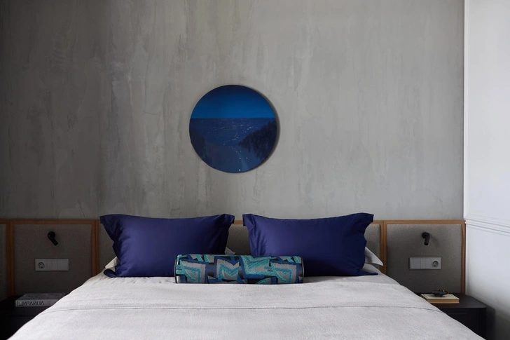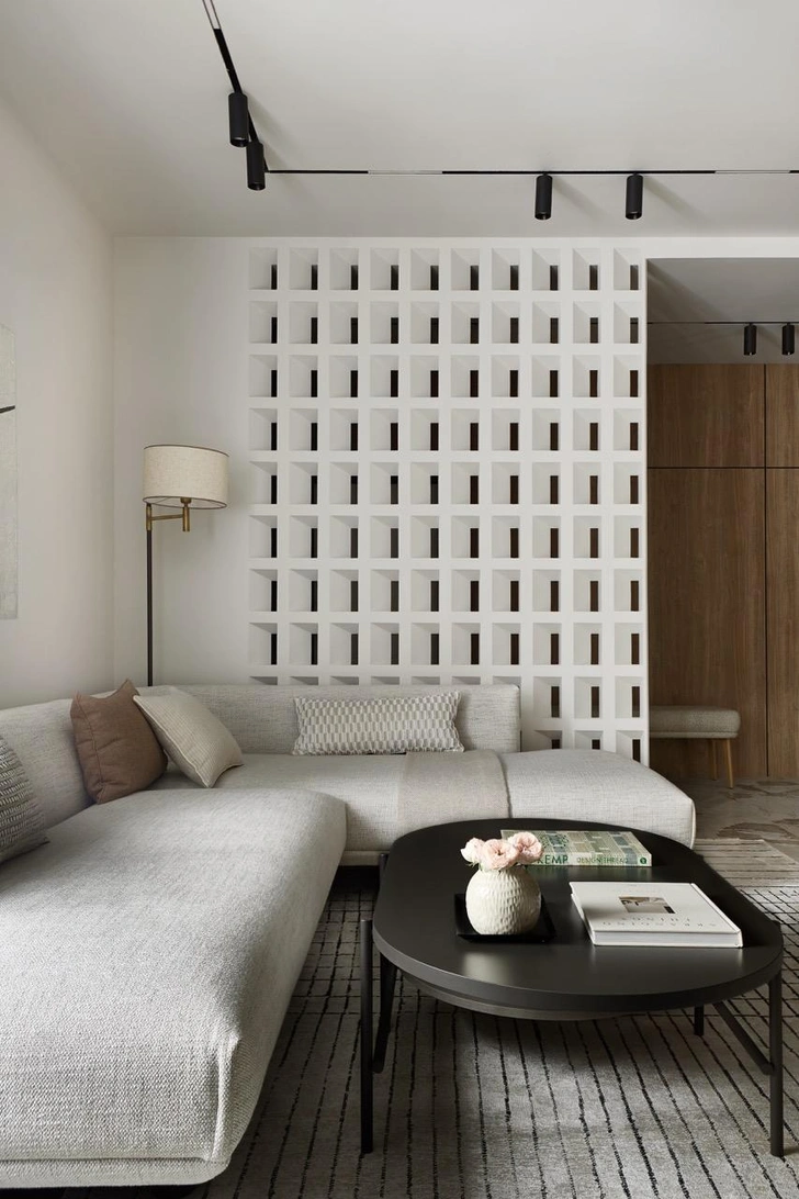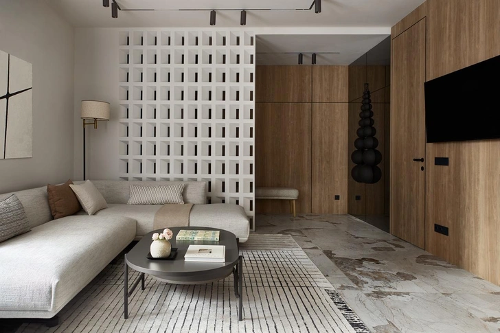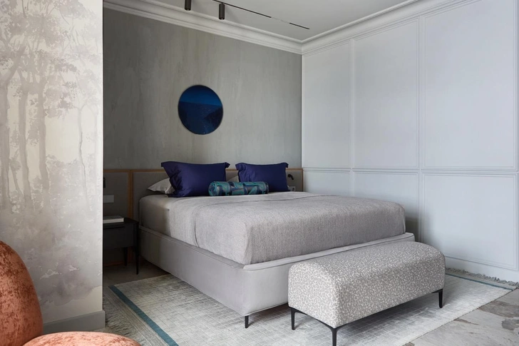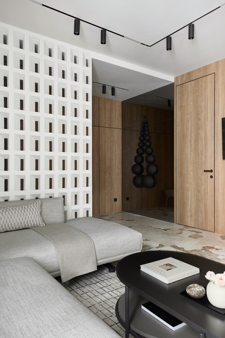 Основой цветовой гаммы стал светлый нейтральный оттенок серого, в спальне он развился в более насыщенный. Есть и акцентный синий цвет — любимый цвет заказчицы. В планировке есть несколько интересных деталей. Мастер-блок и гостевая зона четко разделены, а благодаря скрытым дверям и панелям под шпон нам удалось сделать вход в приватную часть максимально незаметной, защищенной от посторонних взглядов. Другой интересный прием — зонирование прихожей и гостиной с помощью бриз-блоков: они деликатно отделяют входную зону и пропускают свет, сохраняя ощущение открытости и воздушности.
