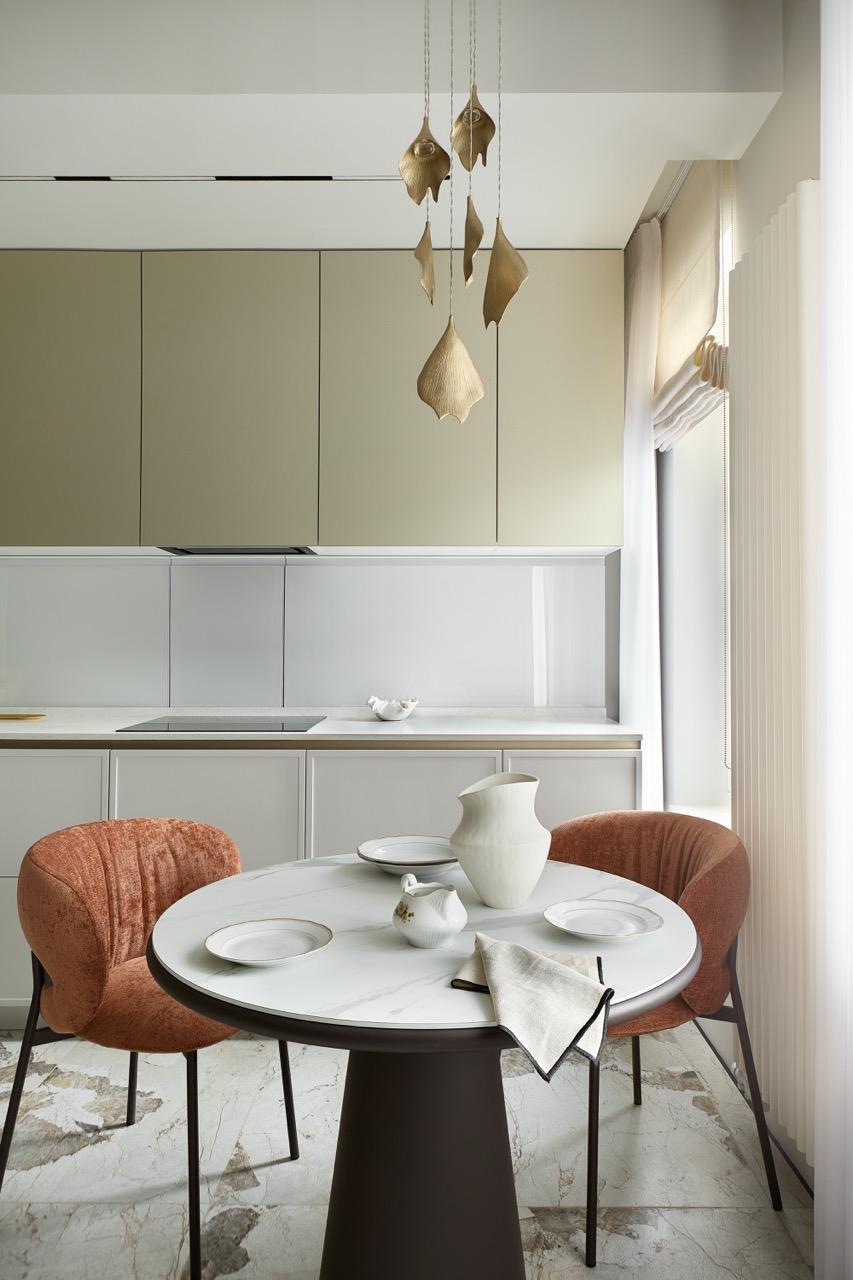 Особой гордостью этого проекта для меня стала кухня, а именно — раздвижной фартук. Это первый опыт и для меня, и для исполнителей. Нужно было все серьезно проработать: объединить материалы кухни в единую композицию, адаптировать конструкцию под сложную систему, заранее предусмотреть дополнительные выводы электрики и другие технические нюансы. Было непросто, но заказчица осталась довольна, а я научилась чему-то новому. Еще на кухне в обеденной зоне изящным акцентом стал светильник российского бренда Vetvi — выразительный, но при этом деликатно вписанный в интерьер.