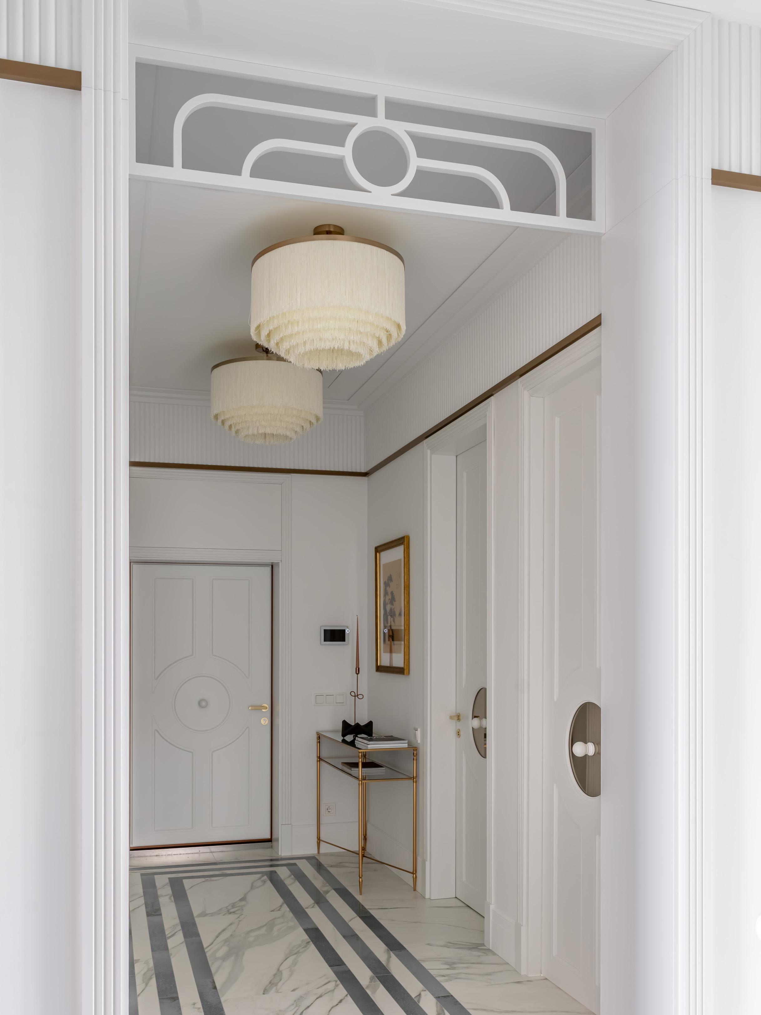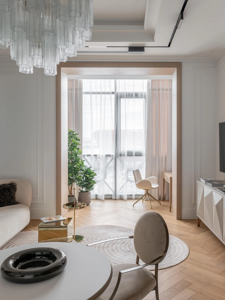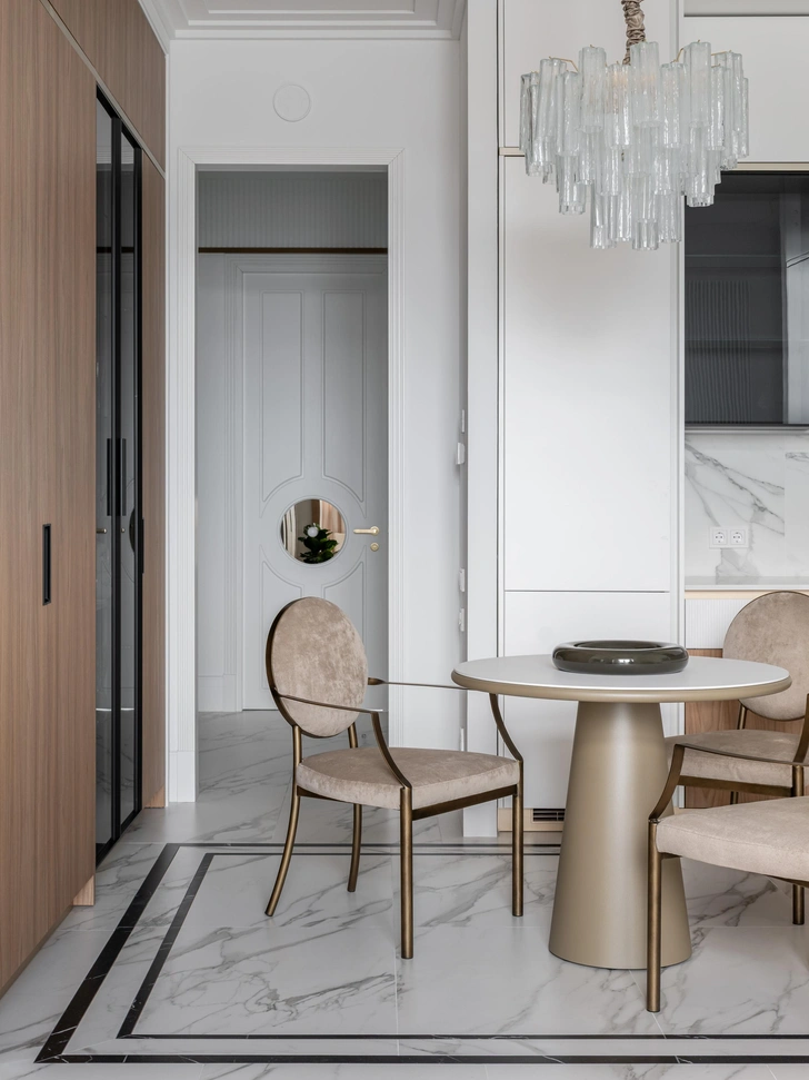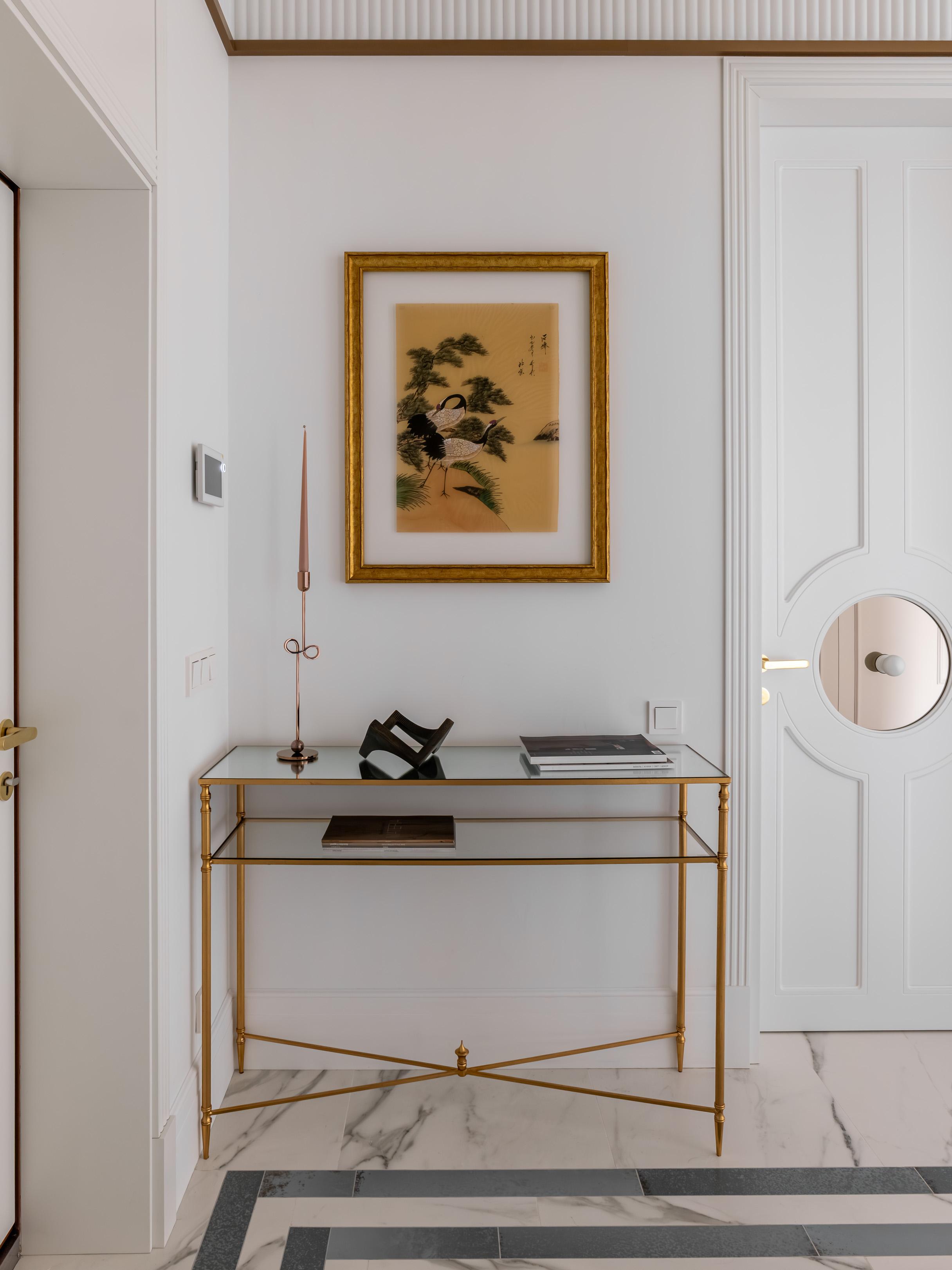 У входа гостей встречает картина с журавлями на тонкой бумаге — ее заказчица привезла из Японии. Композиция наполняет спокойствием, настраивает на созерцание. В коридоре уже можно заметить самую необычную, на мой взгляд, деталь — двери с круглыми зеркальными вставками. Они добавляют динамику и рисуют неожиданные перспективы. Это «мягкое зазеркалье» делает интерьер более живым, многослойным. Двери, кстати, заняли второе место в конкурсе от итальянской фабрики New design porte, и теперь они стали частью ее генерального каталога.