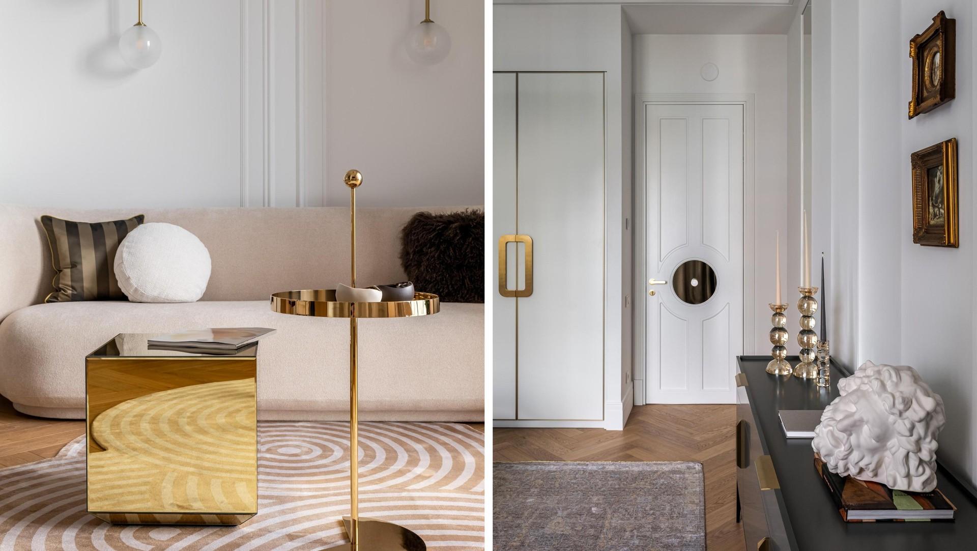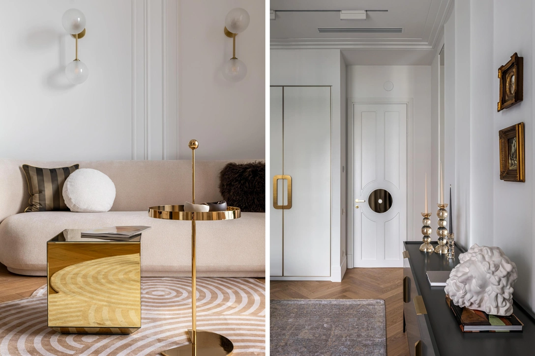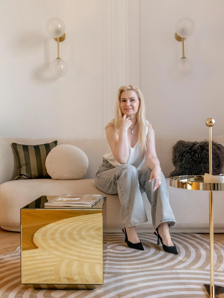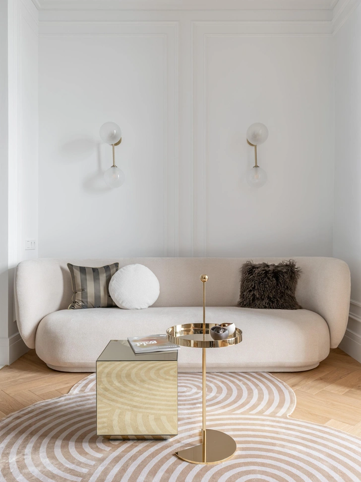 В основе — ар-деко в современной интерпретации. Графичные детали и натуральные материалы обрамили интерьер, наполненный личными историями хозяйки: семья живет среди вещей, которые несут память, характер и красоту. Нейтральная палитра с оттенками бежа, золота, светлого дуба и приглушенного зеленого добавляет легкости и делает интерьер мягким.