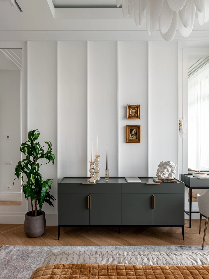 Заказчица делала квартиру для своей дочери и внучки. Она — коллекционер, поэтому здесь можно заметить полотна из ее загородного дома и картины, привезенные из Парижа. Есть место и уральскому искусству: коридор, например, украшает работа художника Михаила Сажаева. В этом проекте все построено на диалоге: строгая геометрия и мягкие линии, отражения зеркал и тепло дерева, российское и зарубежное искусство.