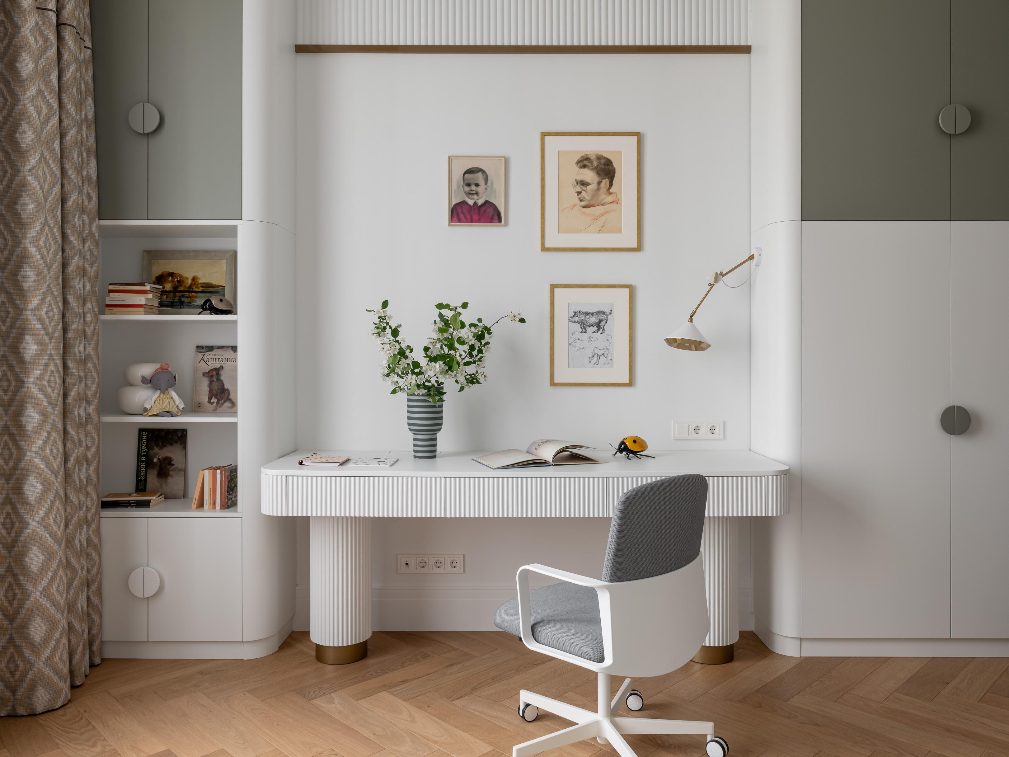 Встроенные шкафы, рабочий стол, «Домье». Рабочее кресло, Pedrali. Детская кровать, 4Room. Пуф Turtle, Gamma. Подвесной светильник, Karman. Покрывало на кровати, Alexandre Turpault. Декоративные подушки, бренд декоративных подушек Ирины Чертихиной. Ваза на столе, AYTM. Аксессуары «Божьи коровки», Laboratório d’Estórias.