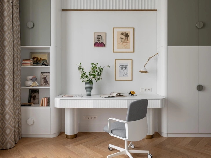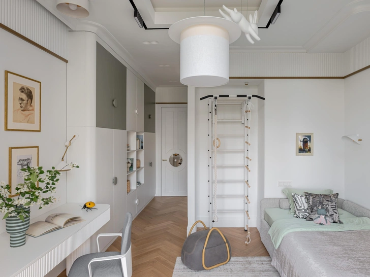 В детской висят карандашные портреты хозяйки и ее мужа, созданные двадцать лет назад преподавателем архитектурной академии. Это не просто декор, а символ семейной памяти, уважения к предкам и бережного отношения к своей истории. Внучка, видя портреты бабушки и дедушки, получает невидимую опору — она растет с осознанием того, что за ней стоит род, традиция и ценности, передаваемые из поколения в поколение. Поэтому интерьер вышел не только красивым, но и наполненным смыслом.