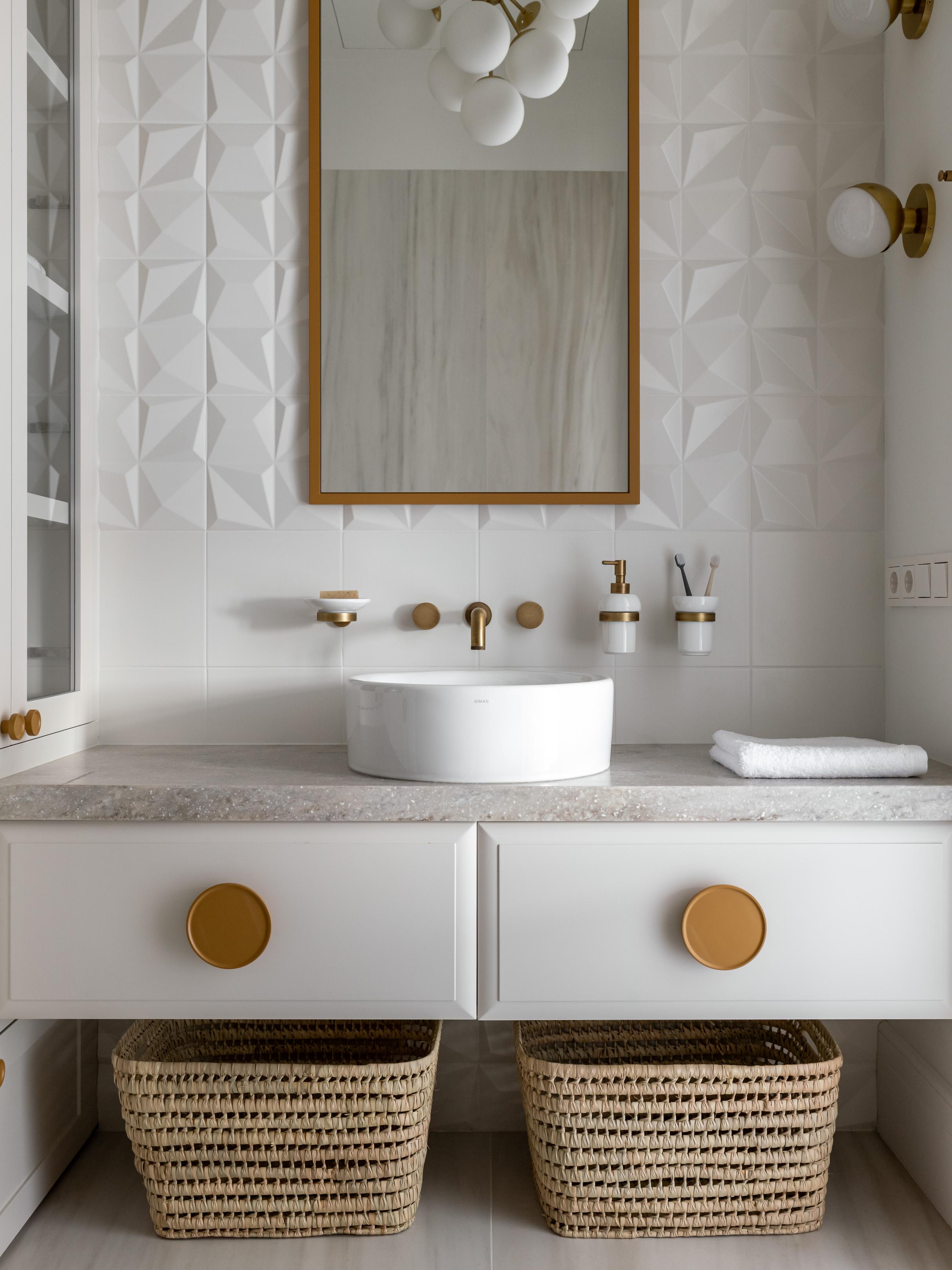 Накладная керамическая раковина, SIMAS. Смесители, Giulini. Два бра на стене, Kai bath sconce. Полотенце и аксессуары, Togas. Мыльница, дозатор для жидкого мыла, стакан настенный, крючок, Giulini. Крупноформатный керамогранит, REX. Керамическая плитка в зоне раковины, Dune Shapes. Корзины под белье, La Forma.