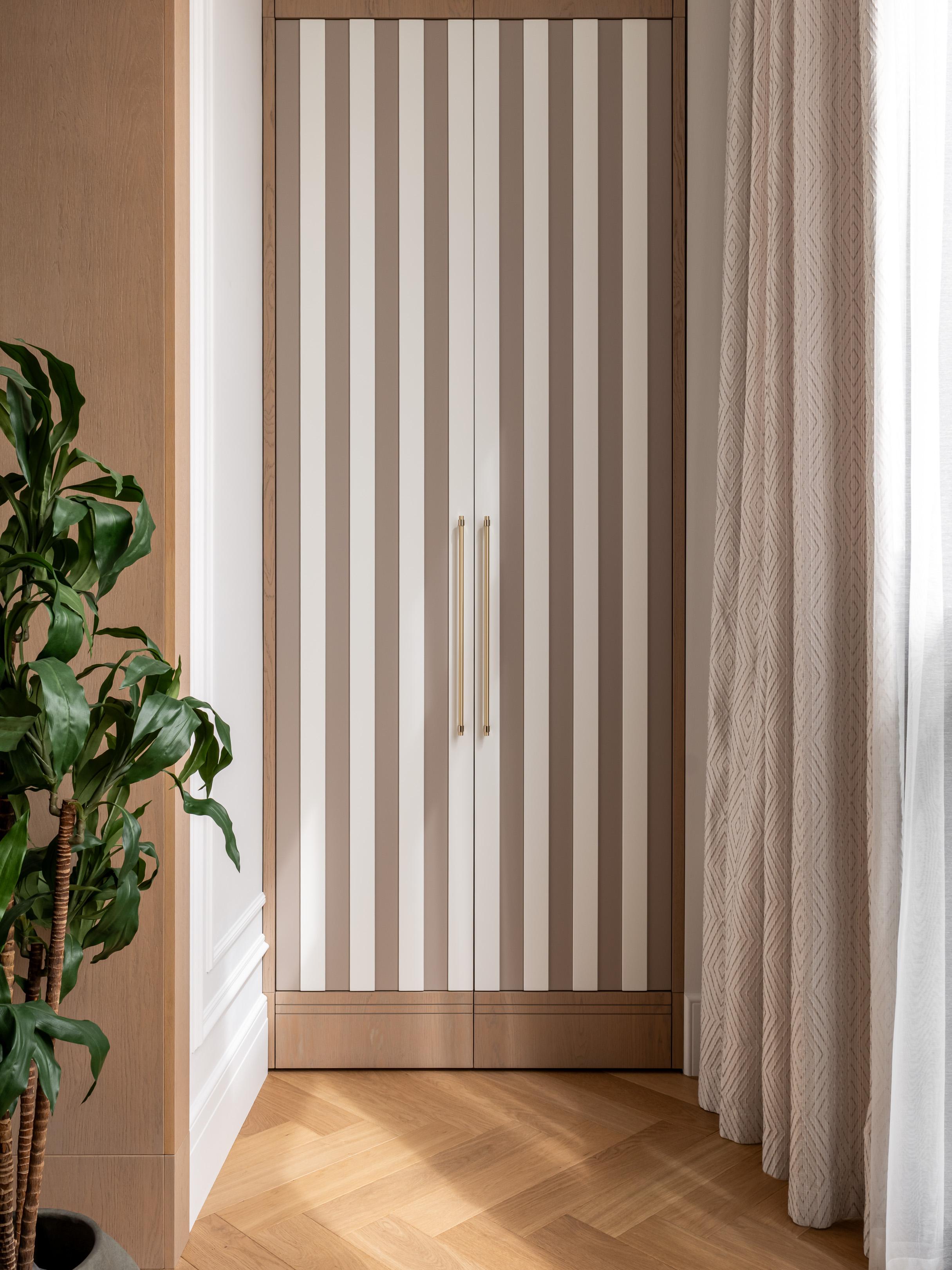 Мы немного изменили планировку: гостиную объединили с балконом, их разделяет широкий шпонированный портал. У окна организовали рабочее место, откуда приятно наблюдать за городом. Еще здесь есть вместительный шкаф, его высоту подчеркивают вертикальные полосы.
