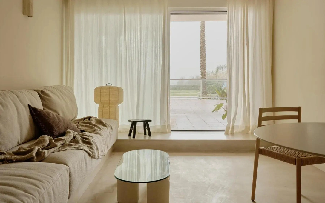 Тепло и тактильное богатство Средиземноморья уравновешиваются сдержанностью, навеянной японским минимализмом. Кухню-гостиную и спальню разделяет раздвижная дверь из полупрозрачного стекла. Она была спроектирована с нуля по образцу японских перегородок сёдзи. В интерьере также присутствуют элементы декора в восточноазиатском стиле, такие как абажуры из рисовой бумаги и прозрачные льняные занавески.