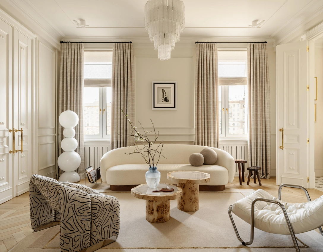 Квартира находится в «сталинке» на набережной Москвы-реки, где в советское время жили высшие партийные работники. «Оригинальные детали были утрачены, но исходные данные впечатляли: потолки высотой более трех метров, гармоничные пропорции окон — все это напоминало османовские квартиры в Париже, которые стали для меня источником вдохновения», — рассказывает дизайнер.