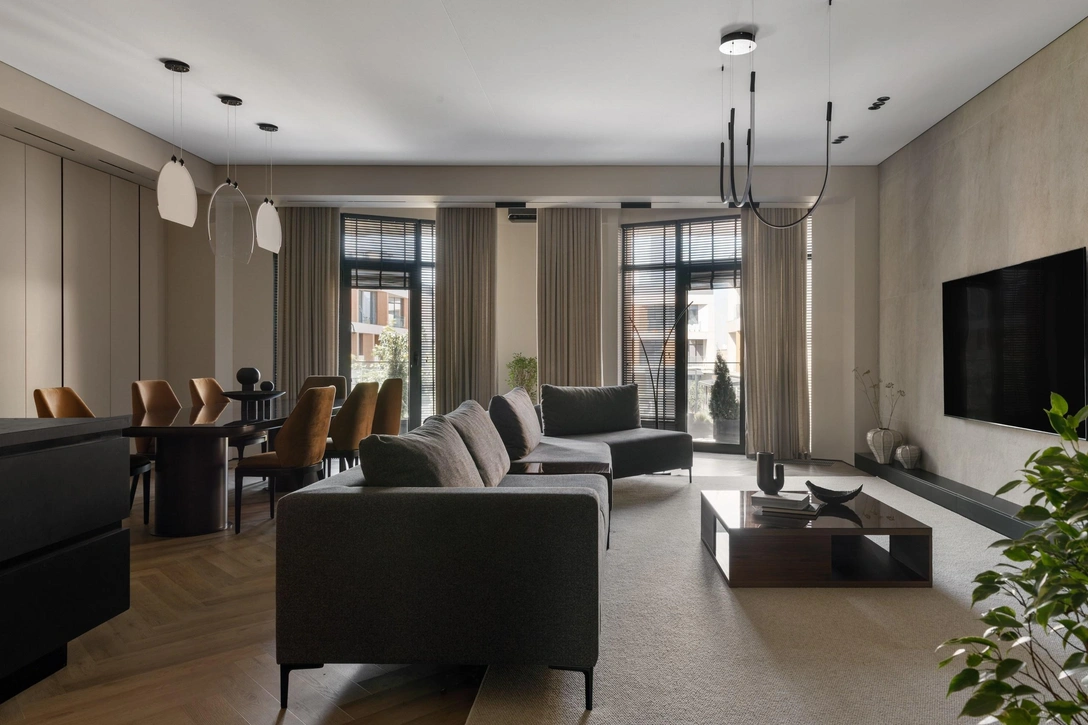 Заказчик хотел интерьер, похожий на комфортные отельные номера, но с домашним теплом и функциональностью. Светлая и просторная планировка, натуральные материалы и цвета — все для спокойной жизни. В основном здесь доминирует серо-бежевый, но встречаются и контрастные акценты — черный и охра.