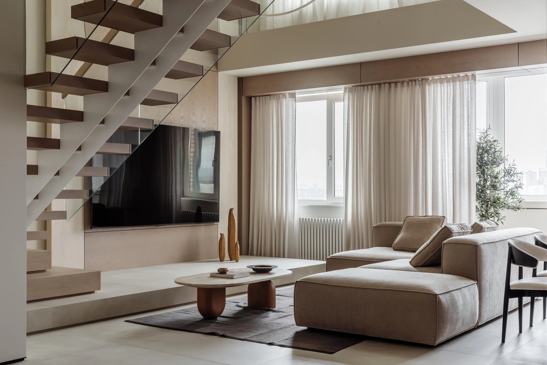 Основные материалы, использованные в отделке, — шпон дымчато-бежевого оттенка и крупноформатный керамогранит с красивой текстурой травертина, которые словно обволакивают пространство теплом. Чтобы усилить этот эффект, мы добавили контрастные черные элементы в виде стеклянного винного стеллажа, верхних подвесных шкафов кухни, электрики, встроенного плинтуса и шторного карниза.