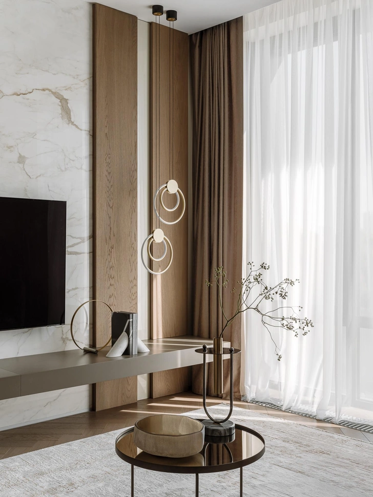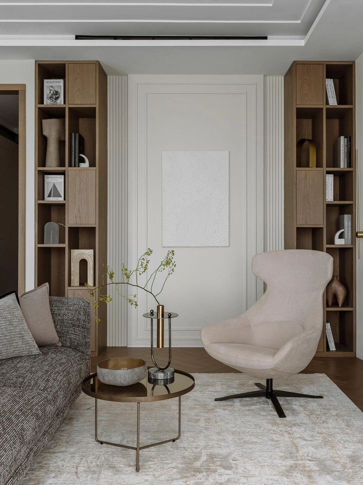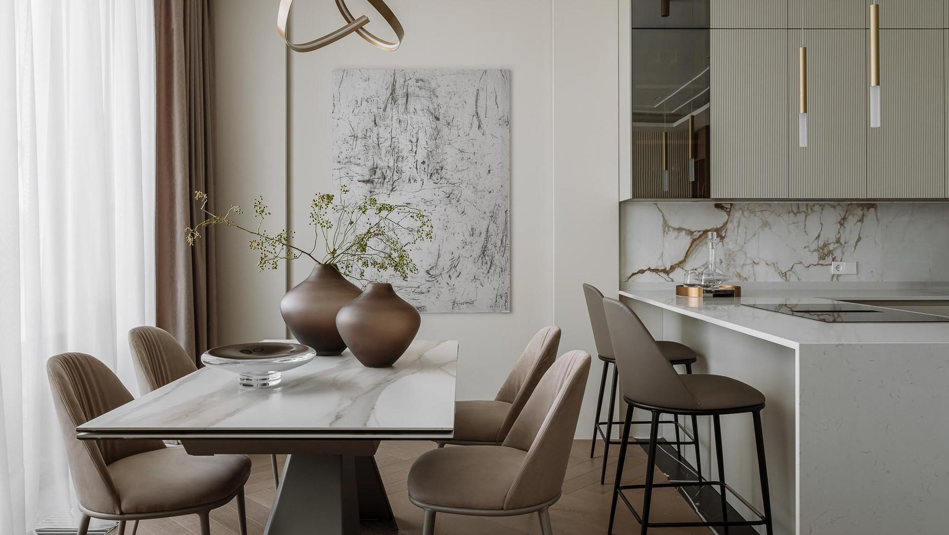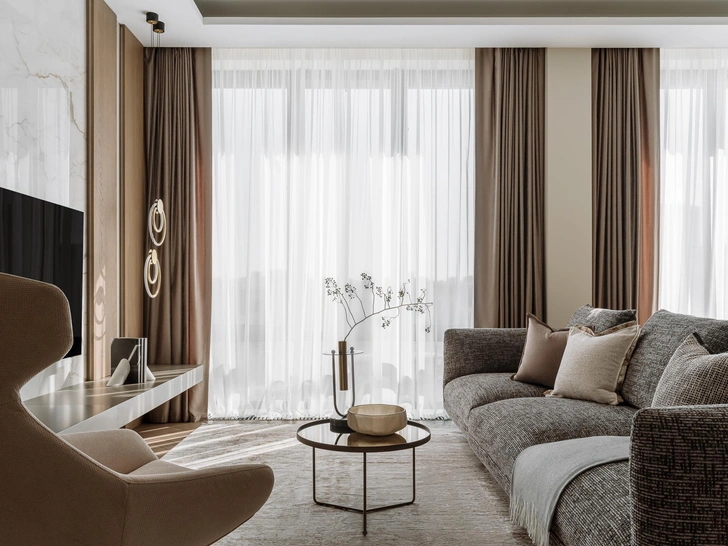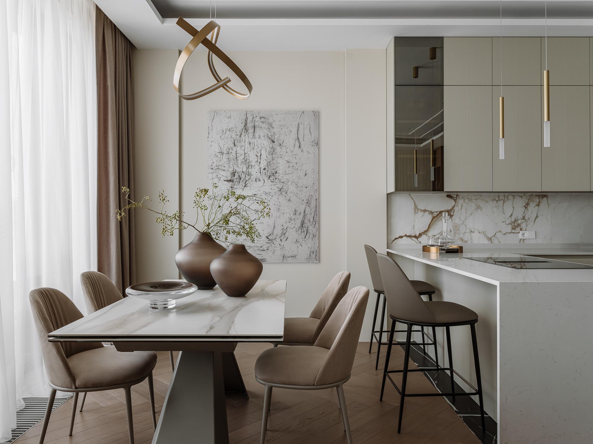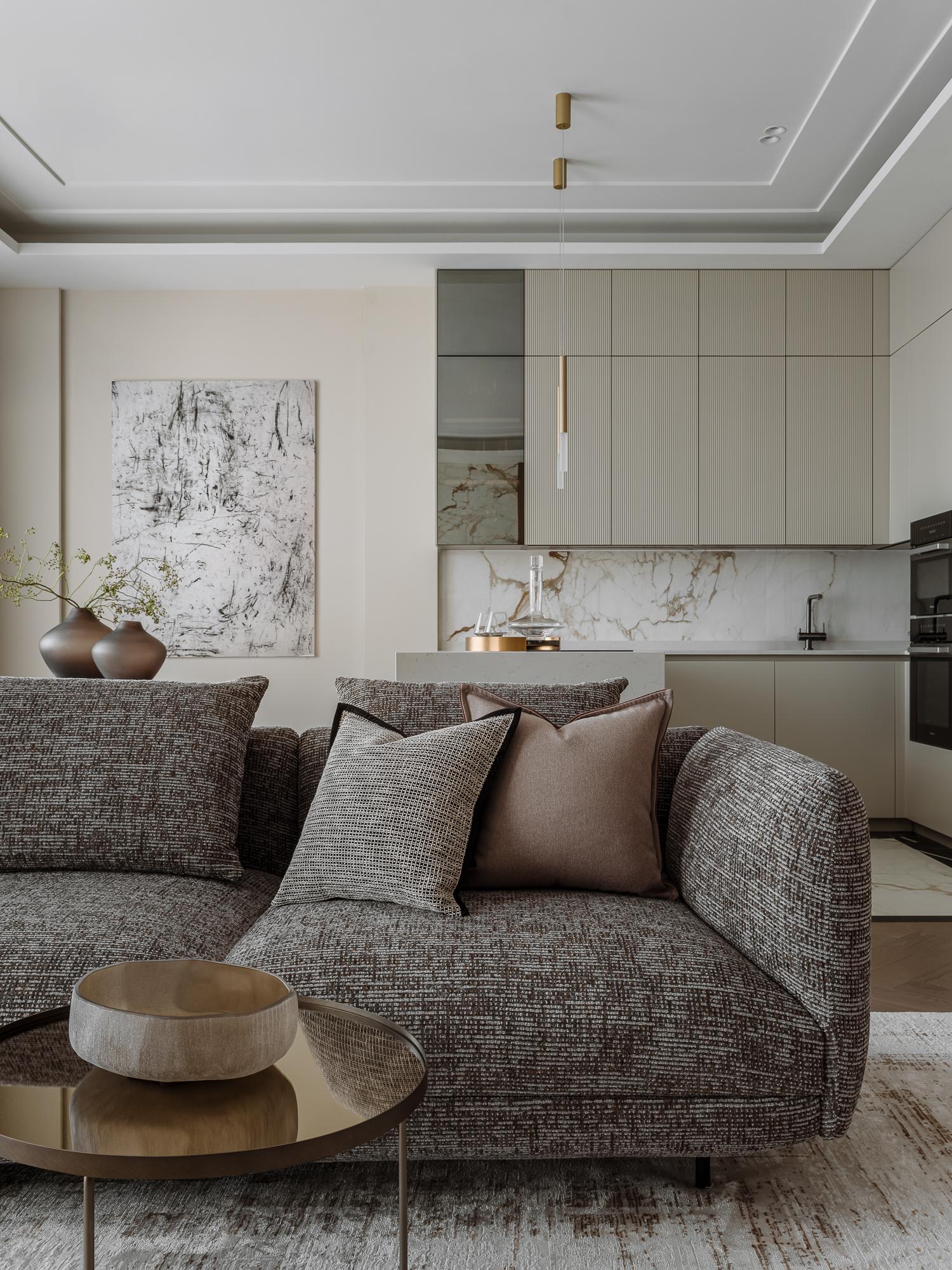 Мягкий, обволакивающий беж в сочетании с оттенками трюфеля и капучино — эта теплая палитра дополнена натуральным деревом, текстурой мрамора и сложными тактильными тканями. Получилась спокойная, но выразительная атмосфера, в которой легко расслабиться.