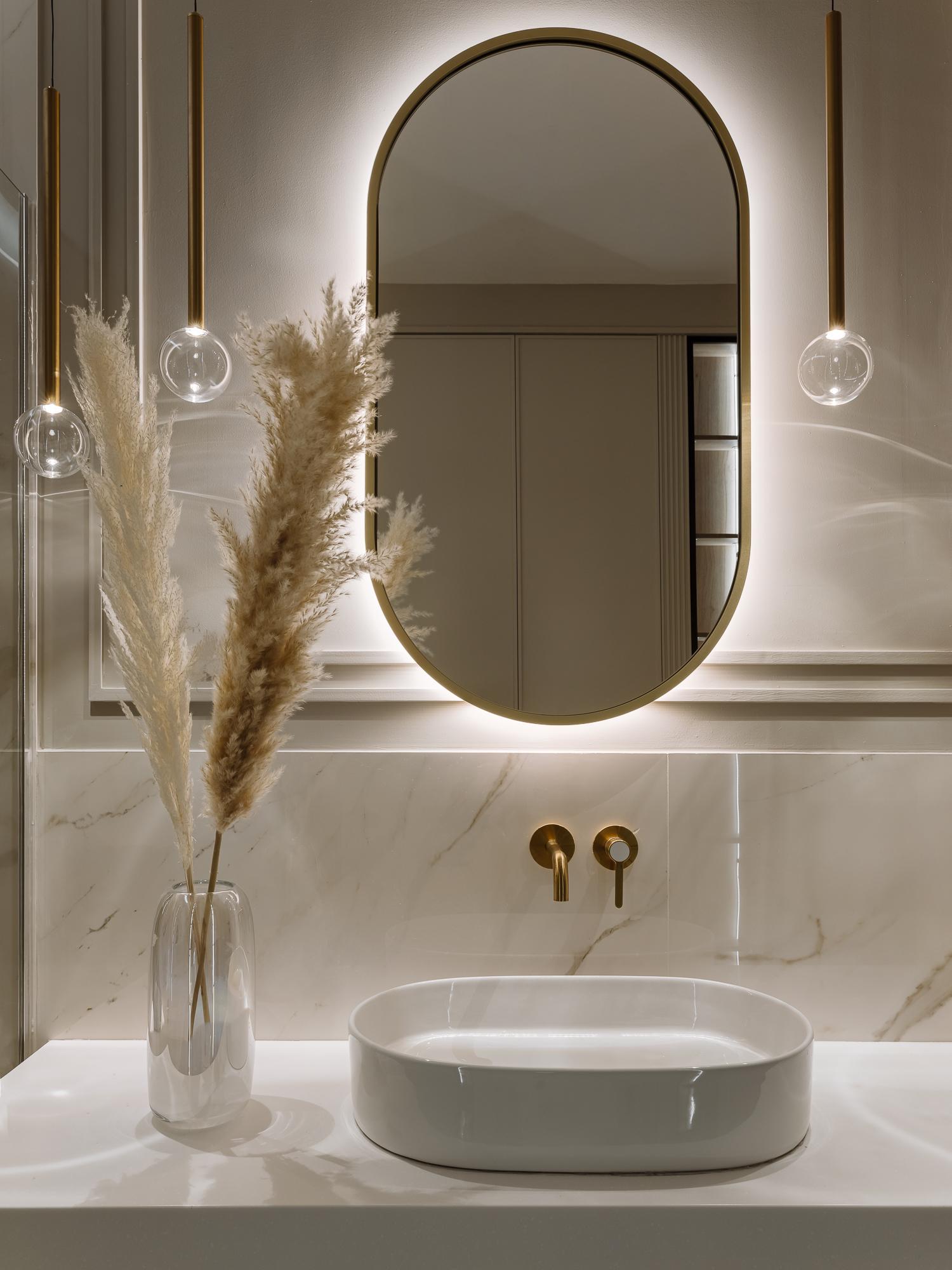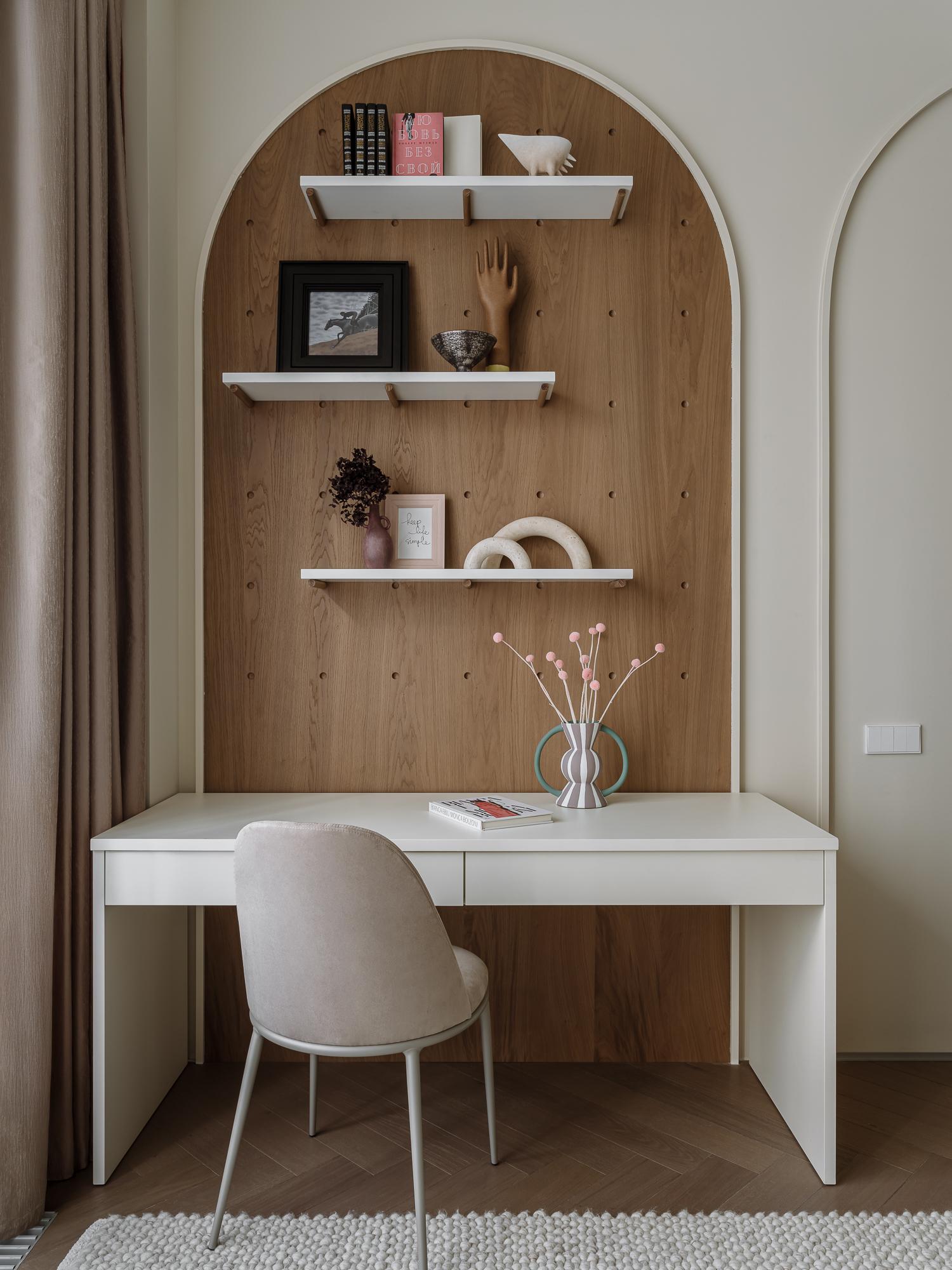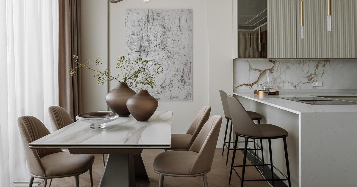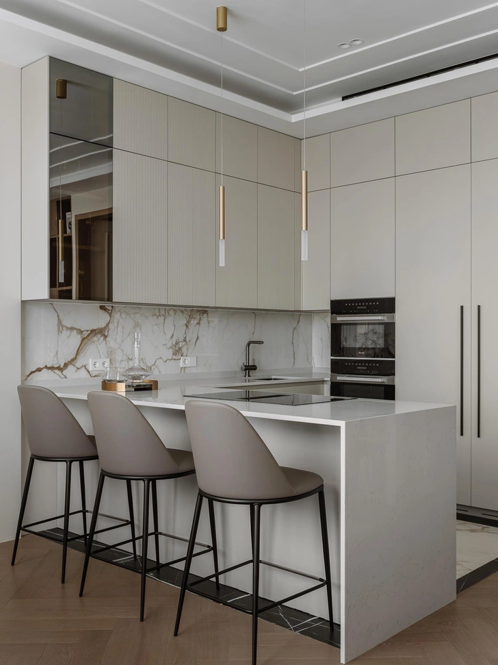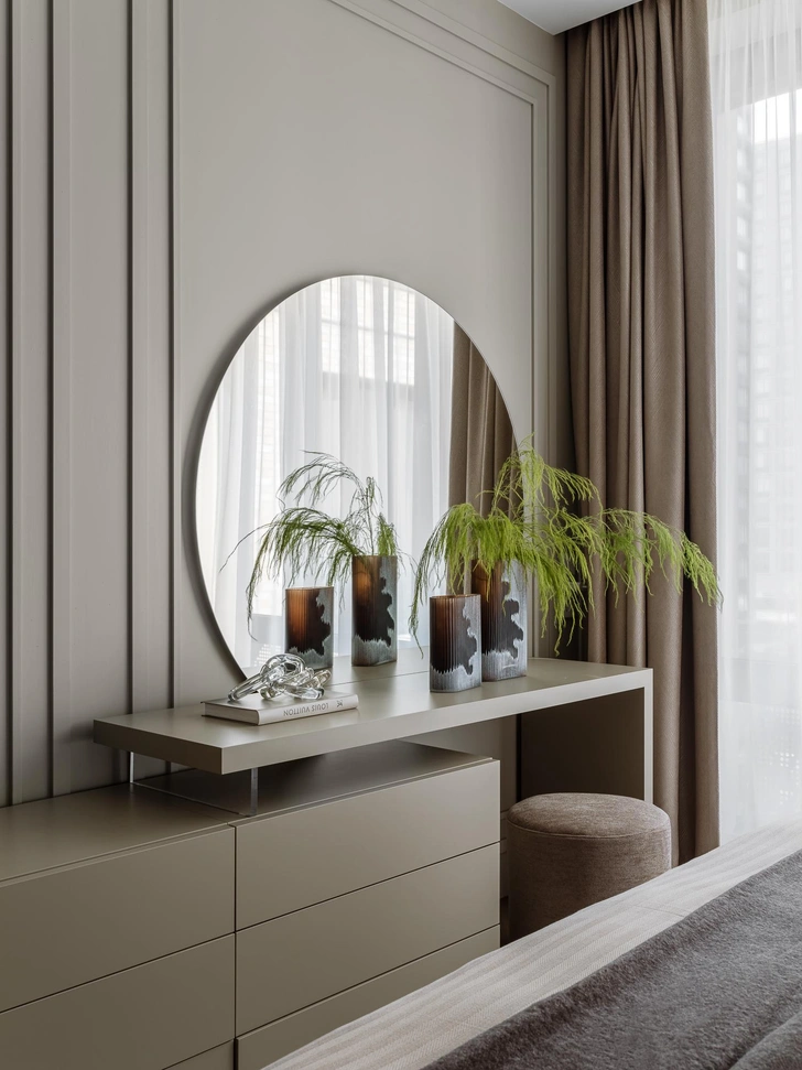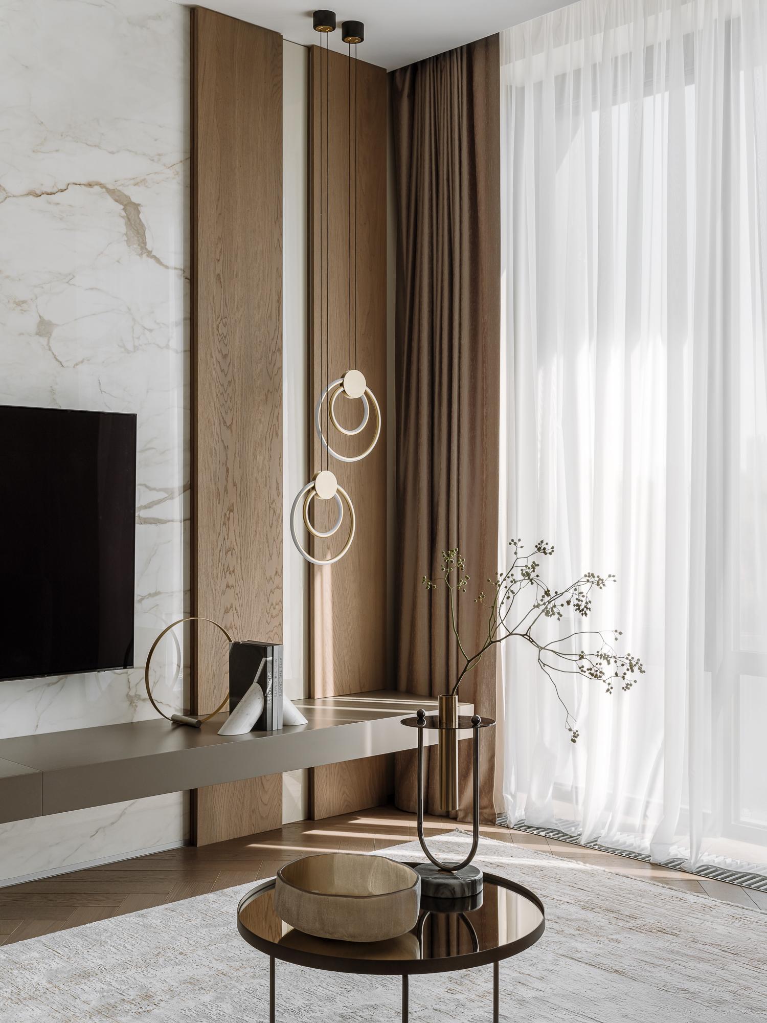 Мягкий, обволакивающий беж в сочетании с оттенками трюфеля и капучино — эта теплая палитра дополнена натуральным деревом, текстурой мрамора и сложными тактильными тканями. Получилась спокойная, но выразительная атмосфера, в которой легко расслабиться.