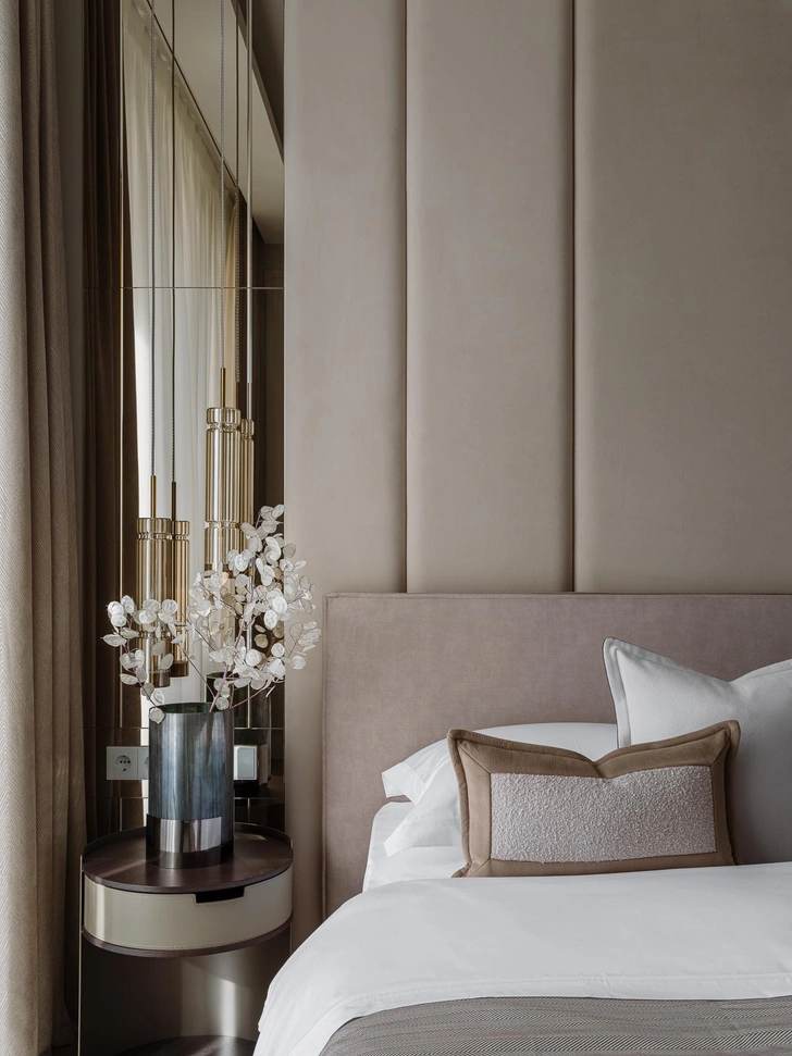 В мастер-спальне сохранилось общее настроение всей квартиры. Здесь дизайнер тоже использовала мягкие, обволакивающие оттенки и много приятных на ощупь материалов. В центре — кровать Felis, по бокам — лаконичные тумбочки Ditre и подвесы Maytoni. Ритма и глубины добавляют стеновые панели и зеркала, они выполнены на заказ на фабрике Toolskiy.