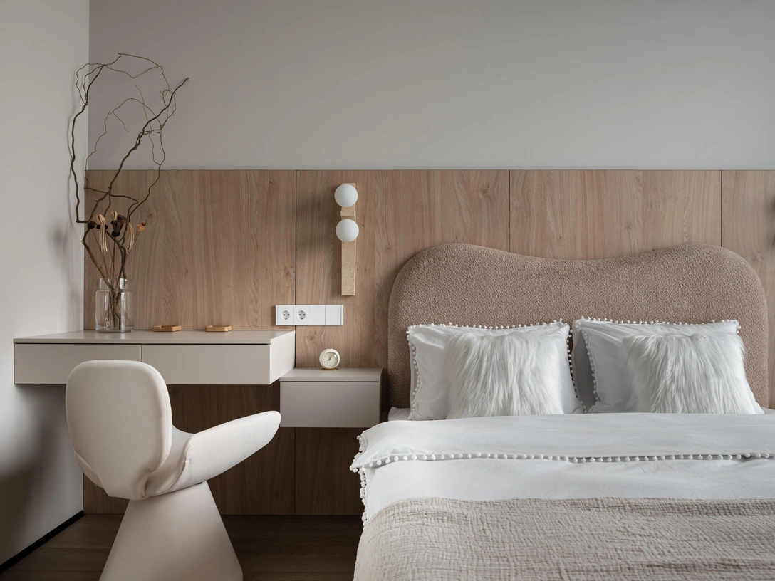 Все поверхности — в единой цветовой температуре, это помогло создать обволакивающую атмосферу. Оттенки крем-брюле в сочетании с деревянными панелями «утепляют» композицию и добавляют воздушности, а мягкая геометрия с плавными переходами и арочными элементами делает интерьер сбалансированным. Еще вместо штор мы использовали деревянные жалюзи — на наш взгляд, это отличное решение для небольших квартир, они регулируют свет и создают приватность, не утяжеляя пространство.